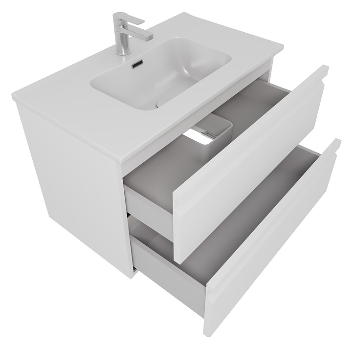Тумба под раковину Aquatek Вега AQ77080-MW дополнит интерьер любой ванной комнаты. Благодаря подвесной конструкции модель не занимает много места и облегчает уборку. Тумба оснащена 2 выдвижными ящиками с доводчиком GTV для плавного скольжения и мягкого закрывания. Боковые поверхности раковины обеспечивают дополнительное пространство для хранения и размещения аксессуаров для ванной. Корпус выполнен из окрашенной ЛДСП Эггер, фасад - из окрашенной ЛМДФ Эггер, ограждение сифона - из пластика, раковина - из санфарфора, который обладает повышенной прочностью и устойчивостью к негативным внешним факторам, а также долгое время сохраняет идеальную белизну и не впитывает запахи и грязь. В комплект поставки входят тумба AQ70080-MW, раковина AQ0480-00, декоративная накладка на отверстие перелива, крепеж и подвесы. Донный клапан и смеситель в комплект поставки не входят. Особенности: