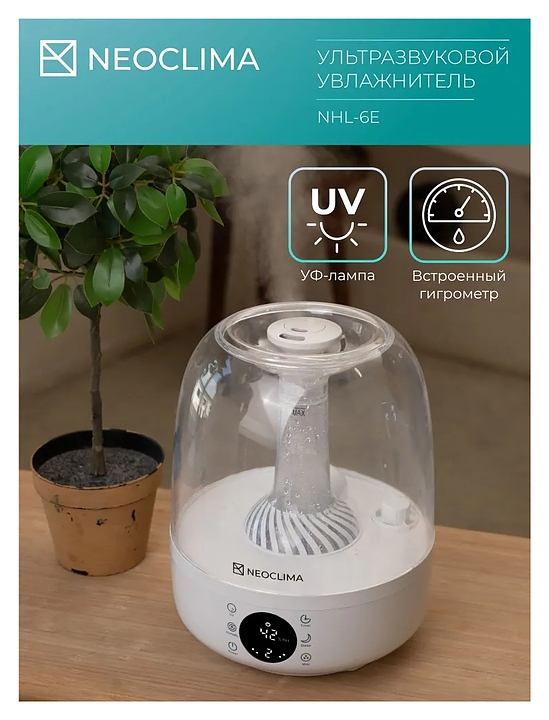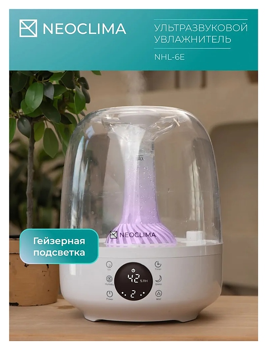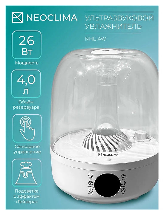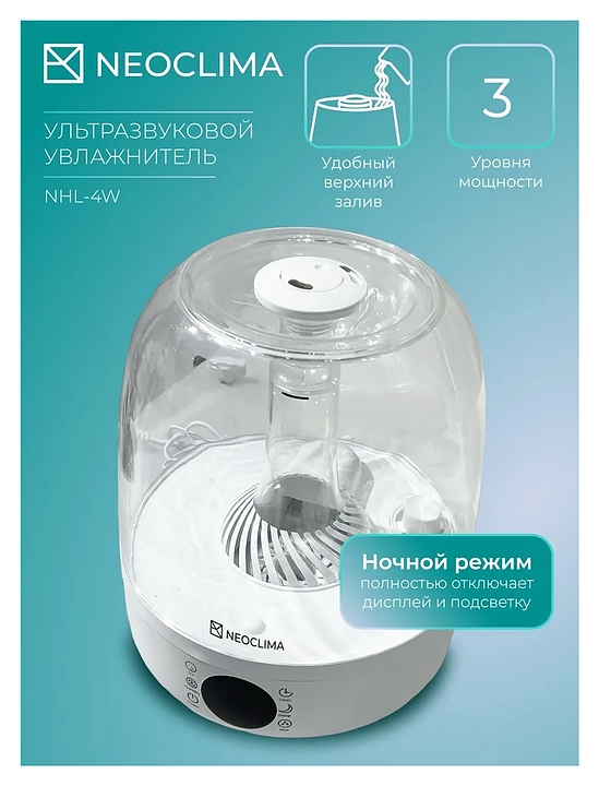 Увлажнитель воздуха ультразвуковой Neoclima NHL-4W создаст комфортный микроклимат в доме, квартире и офисе, поддерживая оптимальный уровень влажности в помещении во время отопительного сезона и жаркого лета. Распыляет воду на ультра-мелкие частицы, используя принцип ультразвукового высокочастотного колебания, и рассеивает водяной туман в воздух через пневматическое устройство для обеспечения равномерного увлажнения воздуха в помещении без капель и налета на мебели и технике. Корпус выполнен из пластика. Особенности: