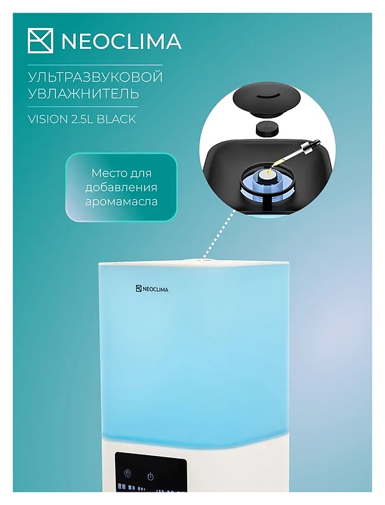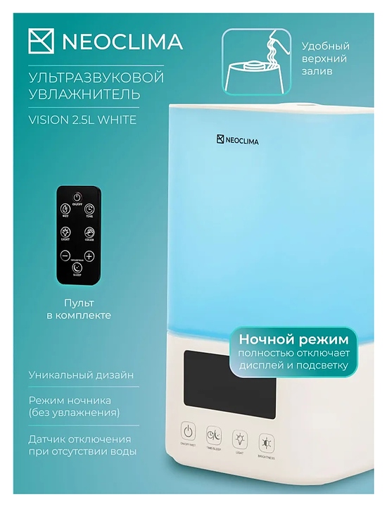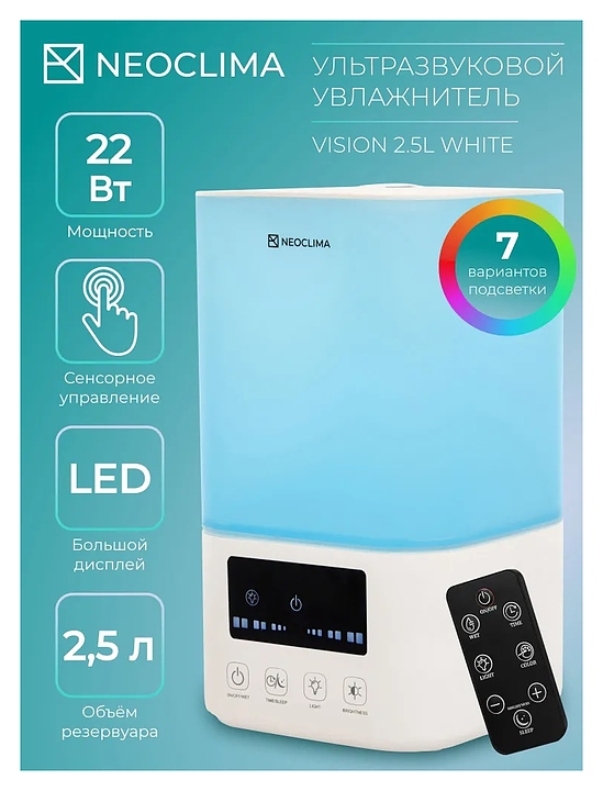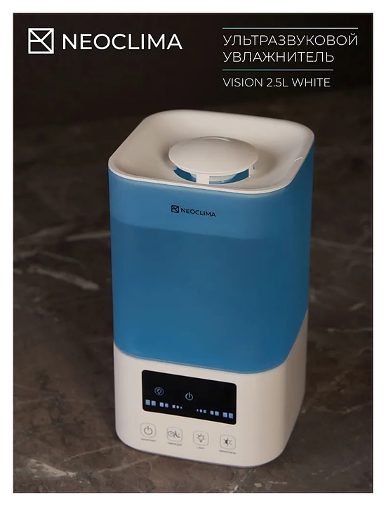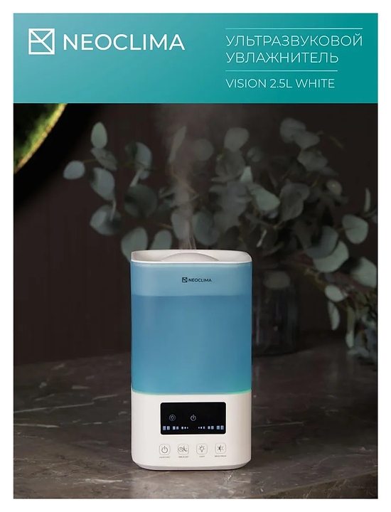 Увлажнитель воздуха ультразвуковой Neoclima VISION 2.5L White создаст комфортный микроклимат в доме, квартире и офисе, поддерживая оптимальный уровень влажности в помещении во время отопительного сезона и жаркого лета. Распыляет воду на ультра-мелкие частицы, используя принцип ультразвукового высокочастотного колебания, и рассеивает водяной туман в воздух через пневматическое устройство для обеспечения равномерного увлажнения воздуха в помещении без капель и налета на мебели и технике. Корпус выполнен из пластика.