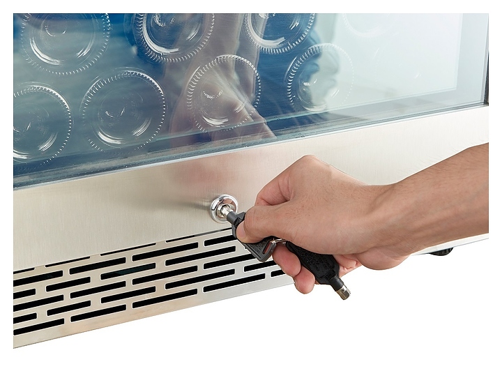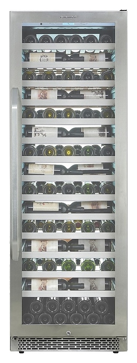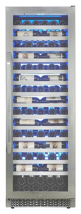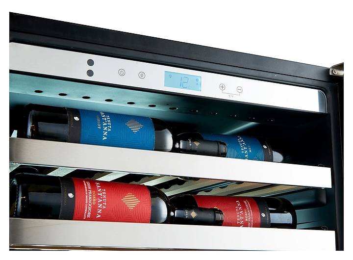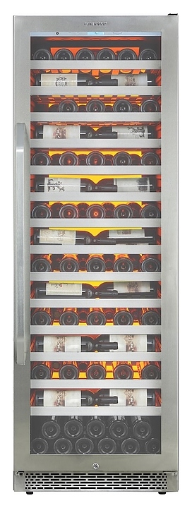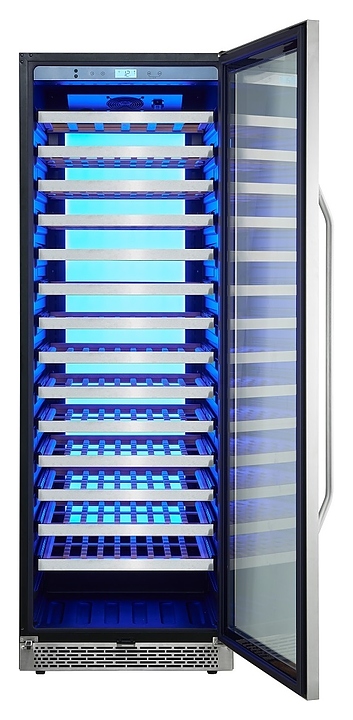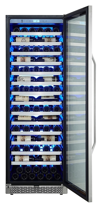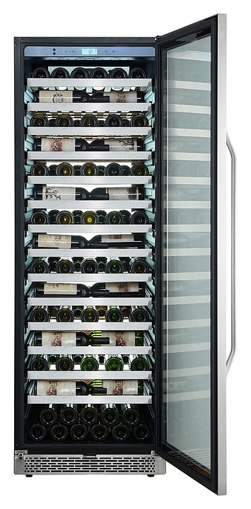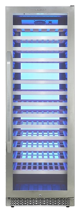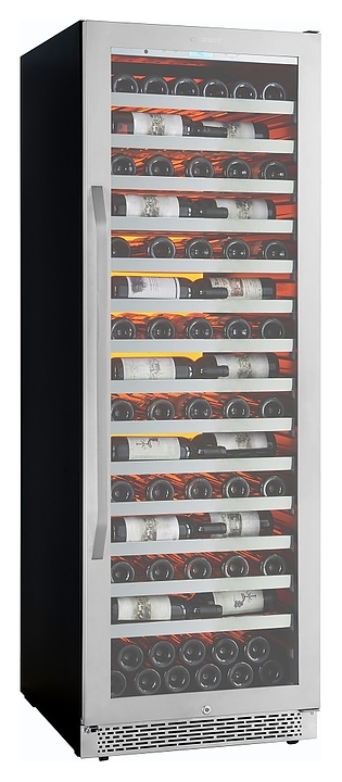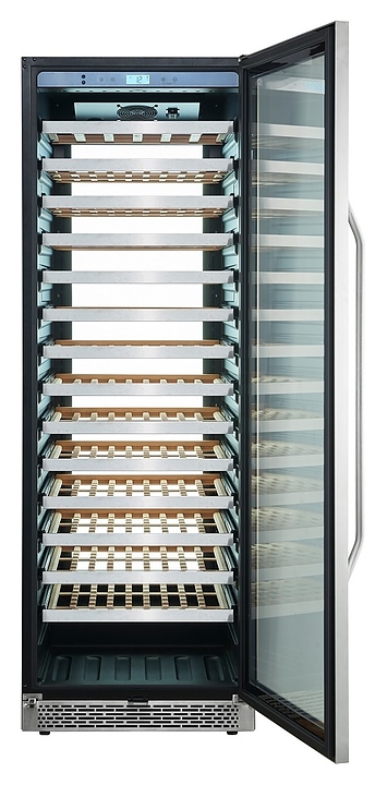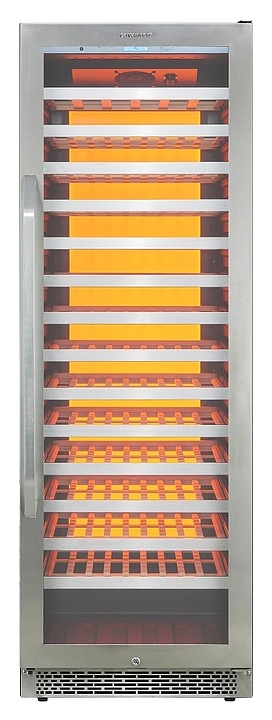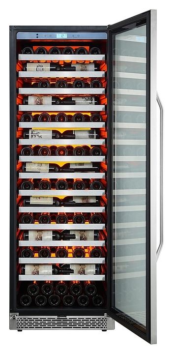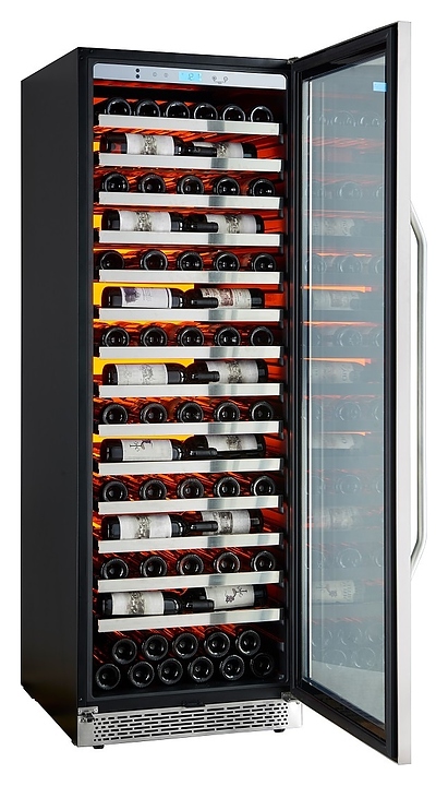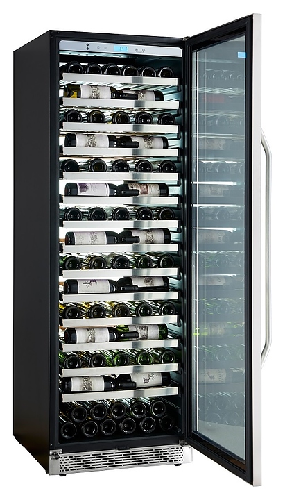 Винный шкаф Cavanova CV135-1TL предназначен для хранения при оптимальных условиях и демонстрации бутилированного вина различных сортов в барах, ресторанах, специализированных магазинах, подсобных складских помещениях, а также в домашних условиях. Модель оснащена монотемпературной холодильной камерой, правосторонней распашной дверью с длинной вертикальной рукояткой, прозрачным обзорным остеклением, цокольной решеткой и расположенной за дверью в верхней части фронта сенсорной панелью управления с жидкокристаллическим дисплеем индикации. Корпус выполнен из металла с антикоррозийным покрытием черного цвета, фронт рамы двери и рукоятка с поверхностью серебристого оттенка, полки – из массива древесины. В комплект поставки входят 14 полок с направляющими для размещения бутылок, комплект ключей к замку, инструкция по эксплуатации и гарантийный талон. Особенности:
