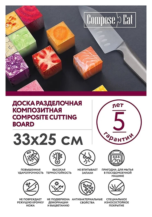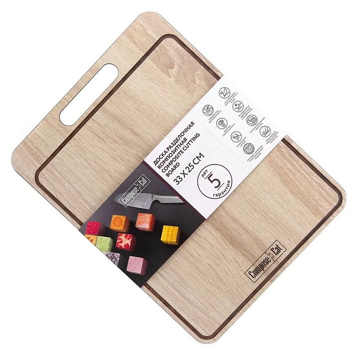 Доска разделочная ComposeEat Everyday DRJ2902052088OA4 предназначена для нарезки различных продуктов и подачи на предприятиях общественного питания и торговли, в частных домах и квартирах. Модель оснащена желобками для стекания жидкости и отверстием для подвешивания. Изделие выполнено из бумажного композитного материала, который отличается ударопрочностью, устойчивостью к резким перепадам температур, деформации и выцветанию. Особенности: