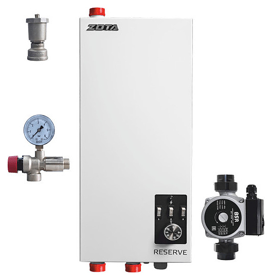 Электрический котел Zota Reserve-Set 9 предназначен для обогрева жилых и производственных помещений, а также нагрева воды для технических целей. Модель оснащена вертикально ориентированными баком, защитным кожухом и расположенной в нижней части фронта электромеханической панелью управления, бак сварной конструкции имеет блок трубчатых электронагревателей (ТЭНов) сверху, входной и выходной патрубки для теплоносителя снизу. Защитный кожух выполнен из листовой стали с внешним антикоррозийным покрытием порошковой краской белого цвета, ТЭНы – из аустенитной нержавеющей стали с нихромовой спиралью, упаковка – из гофрокартона.