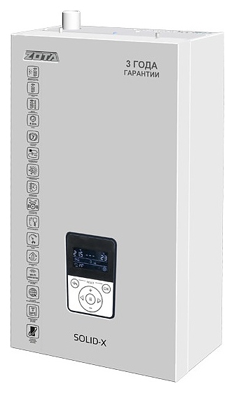 Электрический котел Zota SOLID-X 84 предназначен для обогрева жилых и производственных помещений, а также нагрева воды для технических целей. Модель оснащена вертикально ориентированными баком и защитным кожухом, расположенным на фронтальной панели многофункциональным электронным контроллером X-Line 100E с мембранной клавиатурой и информативным графическим дисплеем с цифровыми и символьными сегментами индикации, бак сварной конструкции имеет 6 блоков трубчатых электронагревателей (ТЭНов) сверху, 2 патрубка для теплоносителя: входной снизу и выходной сверху. Защитный кожух выполнен из листовой стали с внешним антикоррозийным покрытием порошковой краской белого цвета, ТЭНы – из аустенитной нержавеющей стали с нихромовой спиралью, упаковка – из гофрокартона.
