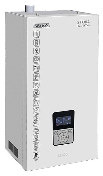Электрический котел Zota LUX-X 60 предназначен для обогрева жилых и производственных помещений, а также нагрева воды для технических целей. Модель оснащена вертикально ориентированными баком и защитным кожухом, расположенным на фронтальной панели многофункциональным электронным контроллером X-Line 100E с мембранной клавиатурой и информативным графическим дисплеем с цифровыми и символьными сегментами индикации, бак сварной конструкции имеет 4 блока трубчатых электронагревателей (ТЭНов) сверху, 2 патрубка для теплоносителя: входной снизу и выходной сверху. Защитный кожух выполнен из листовой стали с внешним антикоррозийным покрытием порошковой краской белого цвета, ТЭНы – из аустенитной нержавеющей стали с нихромовой спиралью, упаковка – из гофрокартона.