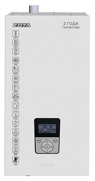 Электрический котел Zota LUX-X 6 предназначен для обогрева жилых и производственных помещений, а также нагрева воды для технических целей. Модель оснащена вертикально ориентированными баком и защитным кожухом, расположенным на фронтальной панели многофункциональным электронным контроллером X-Line 100E с мембранной клавиатурой и информативным графическим дисплеем с цифровыми и символьными сегментами индикации, бак сварной конструкции имеет блок трубчатых электронагревателей (ТЭНов) сверху, 2 патрубка для теплоносителя: входной снизу и выходной сверху. Защитный кожух выполнен из листовой стали с внешним антикоррозийным покрытием порошковой краской белого цвета, ТЭНы – из аустенитной нержавеющей стали с нихромовой спиралью, упаковка – из гофрокартона.