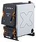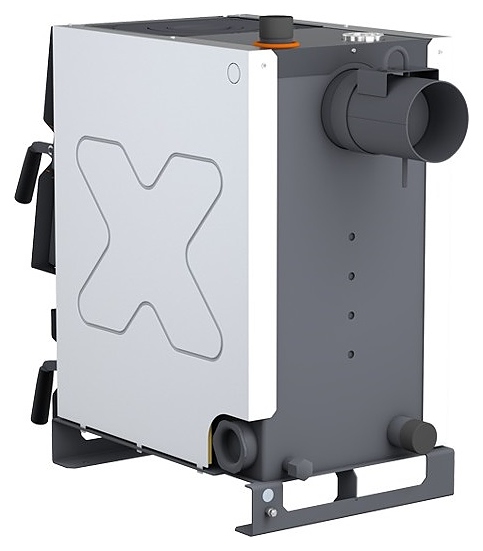 Твердотопливный котел Zota Master X-12П предназначен для теплоснабжения индивидуальных жилых домов и зданий коммунально-бытового назначения, оборудованных системой водяного отопления с принудительной или естественной циркуляцией, а также горячего водоснабжения при наличии бака косвенного нагрева. Вертикально ориентированный корпус состоит из 2 разделенных наклонными колосниками секций: нижней для сбора золы и камерой сгорания (топкой) с горизонтальным трехходовым теплообменником в верхней части и распашной шуровочной решеткой, каждая секция имеет распашную дверь с поворотной рукояткой-фиксатором, зольная секция имеет дополнительную откидную поддувальную дверцу с ручкой-фиксатором и пазом для регулирования подъема, корпус оснащен расположенным на верхней панели патрубком подачи теплоносителя, расположенными на тыльной стенке патрубком обратки теплоносителя, сливным патрубком, фланцем для установки патрубка дымохода и болтом для заземления. Корпус выполнен из листовой стали с внешним антикоррозийным покрытием в комбинации темного и светлого серых тонов с яркими оранжевыми вставками на дверях, изоляция корпуса – из базальтового картона, колосники, решетка и плита с конфоркой – из чугуна.