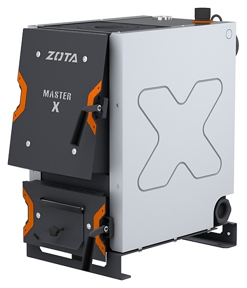 Твердотопливный котел Zota Master X-18П предназначен для теплоснабжения индивидуальных жилых домов и зданий коммунально-бытового назначения, оборудованных системой водяного отопления с принудительной или естественной циркуляцией, а также горячего водоснабжения при наличии бака косвенного нагрева. Вертикально ориентированный корпус состоит из 2 разделенных наклонными колосниками секций: нижней для сбора золы и камерой сгорания (топкой) с горизонтальным трехходовым теплообменником в верхней части и распашной шуровочной решеткой, каждая секция имеет распашную дверь с поворотной рукояткой-фиксатором, зольная секция имеет дополнительную откидную поддувальную дверцу с ручкой-фиксатором и пазом для регулирования подъема, корпус оснащен расположенным на верхней панели патрубком подачи теплоносителя, расположенными на тыльной стенке патрубком обратки теплоносителя, сливным патрубком, фланцем для установки патрубка дымохода и болтом для заземления. Корпус выполнен из листовой стали с внешним антикоррозийным покрытием в комбинации темного и светлого серых тонов с яркими оранжевыми вставками на дверях, изоляция корпуса – из базальтового картона, колосники, решетка и плита с конфоркой – из чугуна.