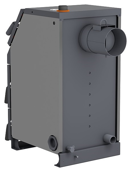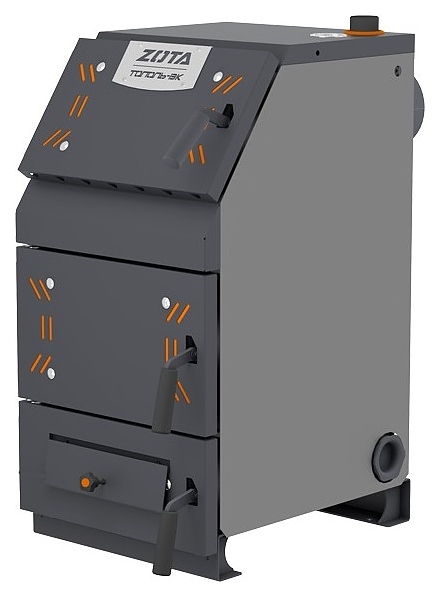 Твердотопливный котел Zota Тополь-ВК 16 предназначен для теплоснабжения индивидуальных жилых домов и зданий коммунально-бытового назначения, оборудованных системой водяного отопления с принудительной или естественной циркуляцией, а также горячего водоснабжения при наличии бака косвенного нагрева. Вертикально ориентированный корпус состоит из 3 секций: верхней загрузочно-прочистной с наклонным фронтом и горизонтальным трехходовым теплообменником увеличенной площади в тыльной части за съемной заслонкой, центральной – камерой сгорания (топкой) с распашной шуровочной решеткой и нижней для сбора золы, каждая секция имеет распашную дверь с поворотной рукояткой-фиксатором, зольная секция имеет дополнительную откидную поддувальную дверцу с ручкой-фиксатором для регулирования подъема, корпус оснащен расположенным на верхней панели патрубком подачи теплоносителя, расположенными на тыльной стенке патрубком обратки теплоносителя, сливным патрубком, фланцем для установки патрубка дымохода и болтом для заземления. Корпус выполнен из листовой стали с усиленными ребрами жесткости панелями и внешним антикоррозийным покрытием в серых тонах, изоляция – из базальтового картона, колосники – из конструкционной стали марки 09Г2С.