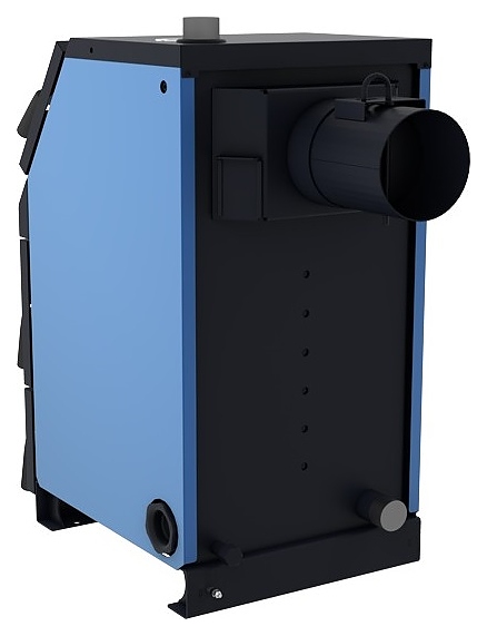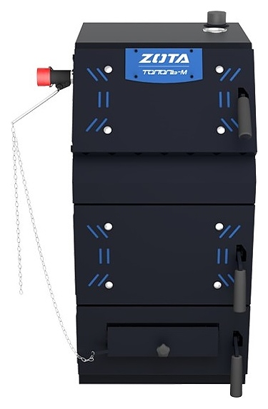 Твердотопливный котел Zota Тополь-М 80 предназначен для теплоснабжения индивидуальных жилых домов и зданий коммунально-бытового назначения, оборудованных системой водяного отопления с принудительной или естественной циркуляцией, а также горячего водоснабжения при наличии бака косвенного нагрева. Вертикально ориентированный корпус состоит из 3 секций: верхней загрузочно-прочистной с наклонным фронтом и горизонтальным трехходовым теплообменником в тыльной части за съемной заслонкой, центральной – камерой сгорания (топкой) с распашной шуровочной решеткой и нижней для сбора золы, каждая секция имеет распашную дверь с поворотной рукояткой-фиксатором, зольная секция имеет дополнительную откидную поддувальную дверцу с ручкой-фиксатором для регулирования подъема, корпус оснащен расположенным на верхней панели патрубком подачи теплоносителя, расположенными на тыльной стенке патрубком обратки теплоносителя, сливным патрубком, фланцем для установки патрубка дымохода и болтом для заземления. Корпус выполнен из листовой стали с усиленными ребрами жесткости панелями и внешним антикоррозийным покрытием в черно-голубой цветовой гамме, изоляция – из базальтового картона, колосники – из чугуна.