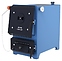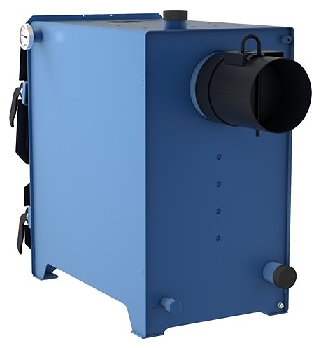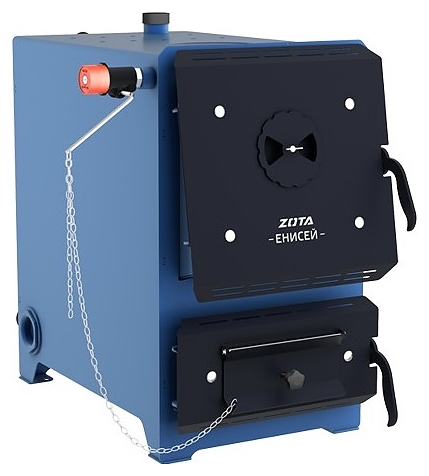 Твердотопливный котел Zota Енисей-18 предназначен для теплоснабжения индивидуальных жилых домов и зданий коммунально-бытового назначения, оборудованных системой водяного отопления с принудительной или естественной циркуляцией, а также горячего водоснабжения при наличии бака косвенного нагрева. Вертикально ориентированный корпус состоит из 2 разделенных наклонными колосниками секций: нижней для сбора золы и камерой сгорания (топкой) с горизонтальным теплообменником в верхней части, каждая секция имеет распашную дверь с поворотной рукояткой-фиксатором, зольная секция имеет дополнительную откидную поддувальную дверцу с ручкой-фиксатором и пазом для регулирования подъема, корпус оснащен расположенным на верхней панели патрубком подачи теплоносителя, расположенными на тыльной стенке патрубком обратки теплоносителя, сливным патрубком, фланцем для установки патрубка дымохода и болтом для заземления. Корпус выполнен из листовой стали с внешним антикоррозийным покрытием в комбинации черного и голубого тонов, колосники и плита с конфорками – из чугуна.