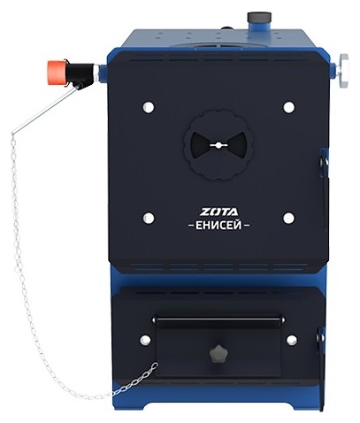Твердотопливный котел Zota Енисей-23 предназначен для теплоснабжения индивидуальных жилых домов и зданий коммунально-бытового назначения, оборудованных системой водяного отопления с принудительной или естественной циркуляцией, а также горячего водоснабжения при наличии бака косвенного нагрева. Вертикально ориентированный корпус состоит из 2 разделенных наклонными колосниками секций: нижней для сбора золы и камерой сгорания (топкой) с горизонтальным теплообменником в верхней части, каждая секция имеет распашную дверь с поворотной рукояткой-фиксатором, зольная секция имеет дополнительную откидную поддувальную дверцу с ручкой-фиксатором и пазом для регулирования подъема, корпус оснащен расположенным на верхней панели патрубком подачи теплоносителя, расположенными на тыльной стенке патрубком обратки теплоносителя, сливным патрубком, фланцем для установки патрубка дымохода и болтом для заземления. Корпус выполнен из листовой стали с внешним антикоррозийным покрытием в комбинации черного и голубого тонов, колосники и плита с конфорками – из чугуна.