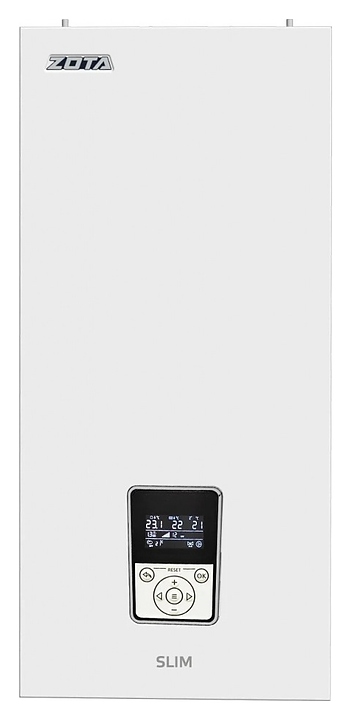 Электрическая миникотельная Zota MK-X Slim 15 предназначена для обогрева жилых и производственных помещений, а также нагрева воды для технических целей. Модель оснащена вертикально ориентированными баком, мембранным расширительным баком, защитным кожухом, 3-х скоростным циркуляционным насосом Zota Ring, манометром, расположенным на фронтальной панели многофункциональным электронным контроллером X-Line 100E с мембранной клавиатурой и информативным графическим дисплеем с цифровыми и символьными сегментами индикации, бак сварной конструкции имеет 2 блока трубчатых электронагревателей (ТЭНов) сверху, входной и выходной патрубки для теплоносителя снизу. Защитный кожух выполнен из листовой стали с внешним антикоррозийным покрытием порошковой краской белого цвета, ТЭНы – из аустенитной нержавеющей стали с нихромовой спиралью, трубки – из меди, фитинги – из латуни, упаковка – из гофрокартона.