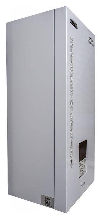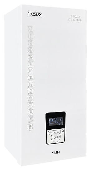 Электрическая миникотельная Zota MK-X Slim 24 предназначена для обогрева жилых и производственных помещений, а также нагрева воды для технических целей. Модель оснащена вертикально ориентированными баком, мембранным расширительным баком, защитным кожухом, 3-х скоростным циркуляционным насосом Zota Ring, манометром, расположенным на фронтальной панели многофункциональным электронным контроллером X-Line 100E с мембранной клавиатурой и информативным графическим дисплеем с цифровыми и символьными сегментами индикации, бак сварной конструкции имеет 2 блока трубчатых электронагревателей (ТЭНов) сверху, входной и выходной патрубки для теплоносителя снизу. Защитный кожух выполнен из листовой стали с внешним антикоррозийным покрытием порошковой краской белого цвета, ТЭНы – из аустенитной нержавеющей стали с нихромовой спиралью, трубки – из меди, фитинги – из латуни, упаковка – из гофрокартона.