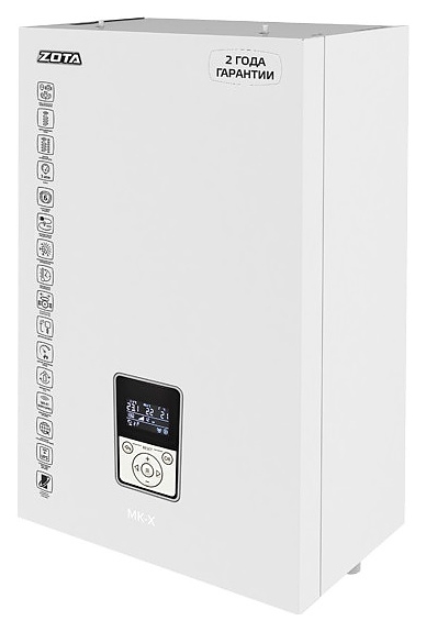 Электрический котел Zota MK-X 14 предназначен для обогрева жилых и производственных помещений, а также нагрева воды для технических целей. Модель оснащена вертикально ориентированными баком, мембранным расширительным баком, защитным кожухом, 3-х скоростным циркуляционным насосом Zota Ring 25/60, манометром, расположенным на фронтальной панели многофункциональным электронным контроллером X-Line 100E с мембранной клавиатурой и информативным графическим дисплеем с цифровыми и символьными сегментами индикации, бак сварной конструкции имеет 2 блока трубчатых электронагревателей (ТЭНов) сверху, входной и выходной патрубки для теплоносителя снизу. Защитный кожух выполнен из листовой стали с внешним антикоррозийным покрытием порошковой краской белого цвета, ТЭНы – из аустенитной нержавеющей стали с нихромовой спиралью, упаковка – из гофрокартона.