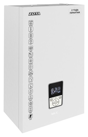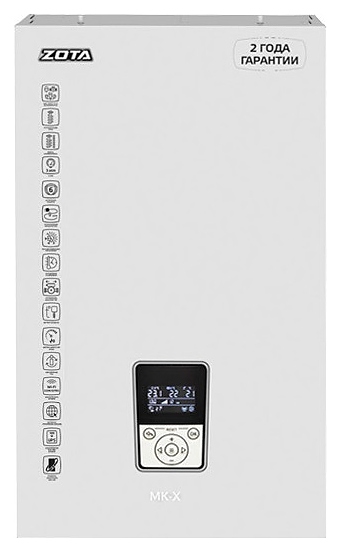 Электрический котел Zota MK-X 30 предназначен для обогрева жилых и производственных помещений, а также нагрева воды для технических целей. Модель оснащена вертикально ориентированными баком, защитным кожухом, 3-х скоростным циркуляционным насосом Zota Ring 25/70, манометром, расположенным на фронтальной панели многофункциональным электронным контроллером X-Line 100E с мембранной клавиатурой и информативным графическим дисплеем с цифровыми и символьными сегментами индикации, бак сварной конструкции имеет 3 блока трубчатых электронагревателей (ТЭНов) сверху, входной и выходной патрубки для теплоносителя снизу. Защитный кожух выполнен из листовой стали с внешним антикоррозийным покрытием порошковой краской белого цвета, ТЭНы – из аустенитной нержавеющей стали с нихромовой спиралью, упаковка – из гофрокартона.