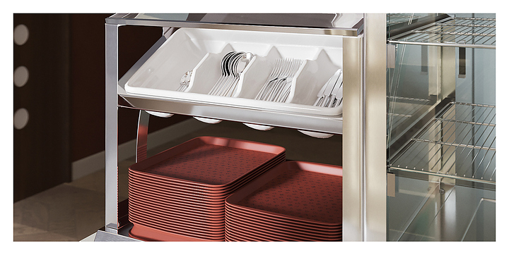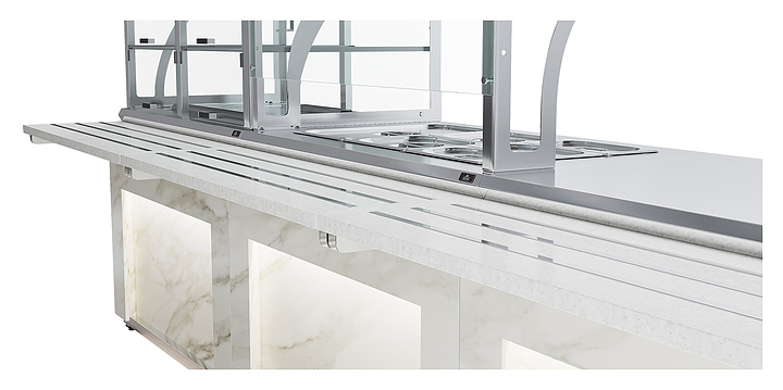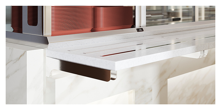 Прилавок кассовый универсальный Luxstahl КК-1200 Premium Portal (Портал) с направляющей для подносов из нержавеющей стали используется в составе линии раздачи Portal на предприятиях общественного питания и торговли для оборудования рабочего места продавца-кассира. Модель оснащена дополнительной полкой и отверстием для кабеля. Каркас выполнен из нержавеющей стали AISI 430 толщиной 1 мм, фасад - из окрашенного МДФ, направляющая для подносов - из профильной трубы 25х25 мм. Особенности: