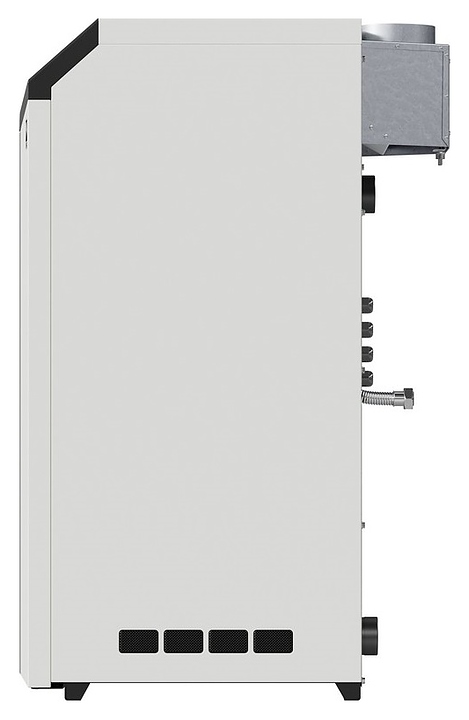 Газовый отопительный котел Лемакс Omega E-12.5 предназначен для эксплуатации в системах отопления с принудительной или естественной циркуляцией теплоносителя в жилых и загородных частных домах, а также других бытовых и хозяйственных объектах. Модель оснащена газогорелочным устройством с инжекционными микрофакельными горелками Polidoro (Италия) и автоматикой безопасности SIT 845 Sigma (Италия), сварным теплообменником с цилиндрическими дымогарными каналами и турбулизаторами, расположенной на верхней фронтальной наклонной стенке электронной панелью управления с сенсорными функциональными клавишами и цветным жидкокристаллическим дисплеем индикации, расположенными на тыльной стенке патрубком дымохода, резьбовым штуцером для подключения газа, патрубками подачи и обратки отопительного контура. Вертикально ориентированный корпус выполнен из стали с антикоррозийным покрытием в комбинации черного и белого тонов, теплообменник – из высококачественной стали с покрытием антикоррозийной термостойкой эмалью и обработкой ингибирующим соли составом, горелки – из жаропрочной нержавеющей стали, оплетка газового шланга – из нержавеющей стали.