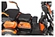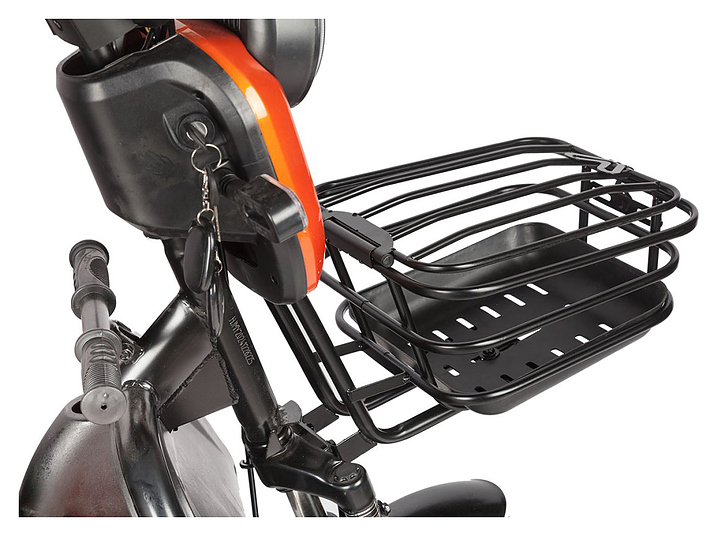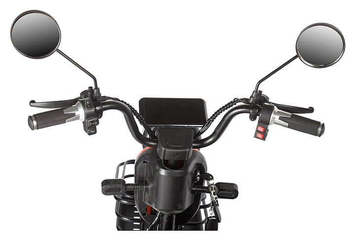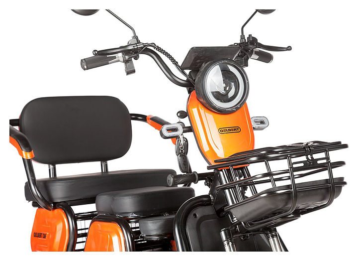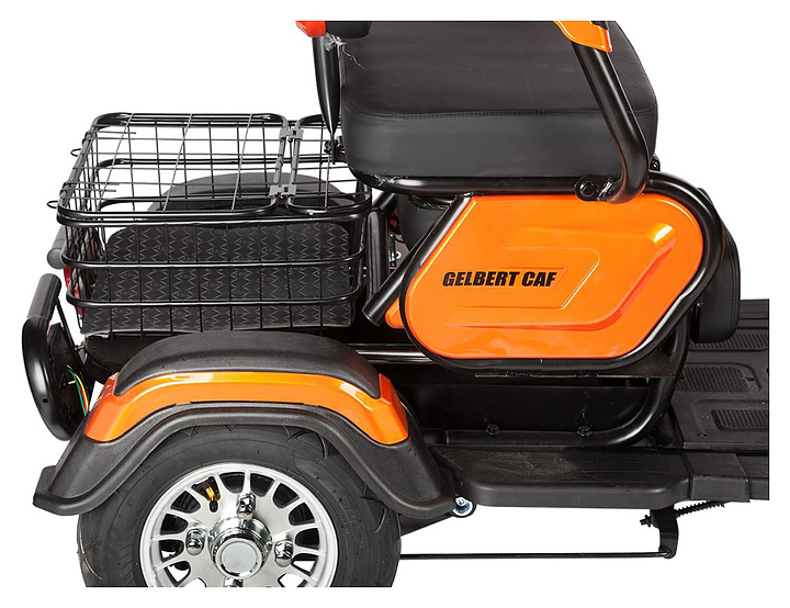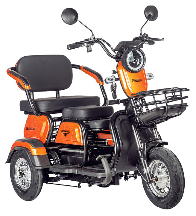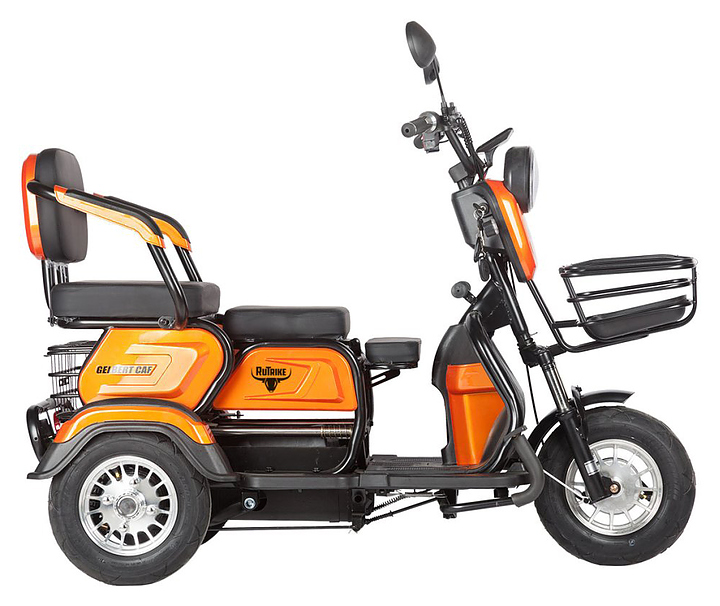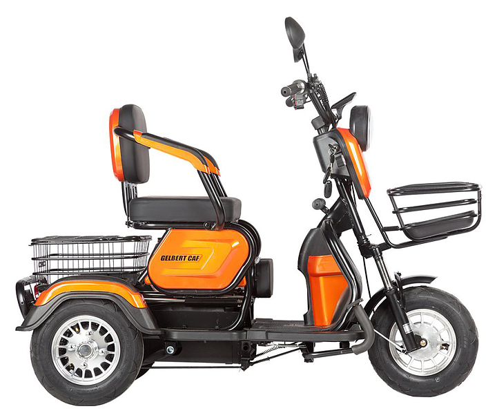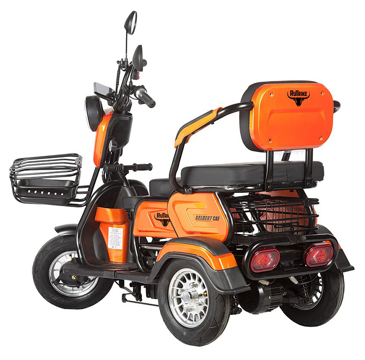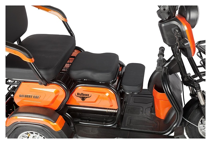 Трицикл Rutrike Gelbert Caf используется для комфортного передвижения по городским улицам в сухую погоду, а также перевозки пассажиров и бытовых грузов. Модель оснащена яркой светодиодной фарой, поворотниками, корзинами на руле и под сиденьем водителя, большим LCD-дисплеем на приборной панели, ручками для ребенка на передних дугах, а также дополнительными сиденьями, которые можно сложить и открыть доступ к вместительной корзине. Передняя вилка и задние пружинные амортизаторы гарантируют комфортную езду. Корзины выполнены из металла. В комплект поставки входят 2 брелока. Аккумуляторные батареи и зарядное устройство в комплект поставки не входят. Особенности: