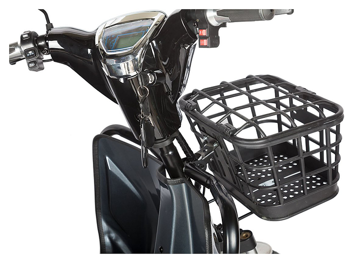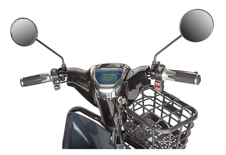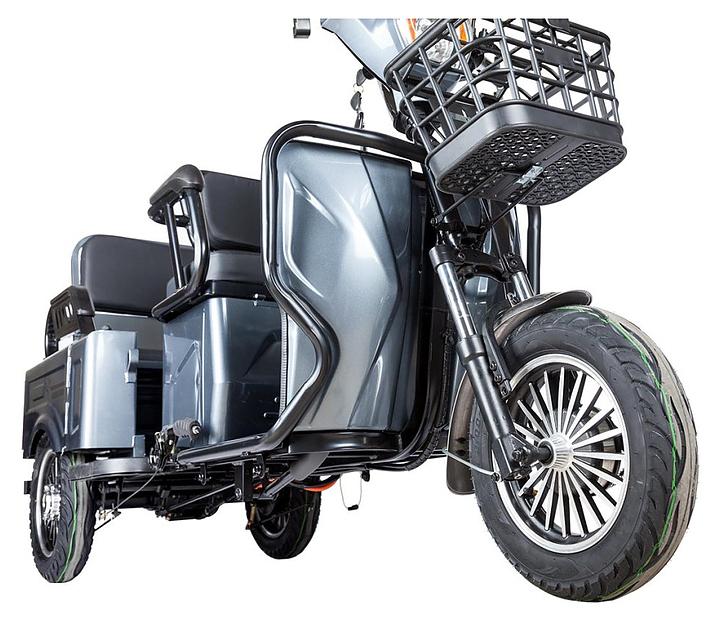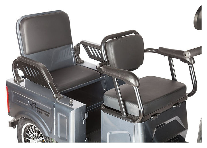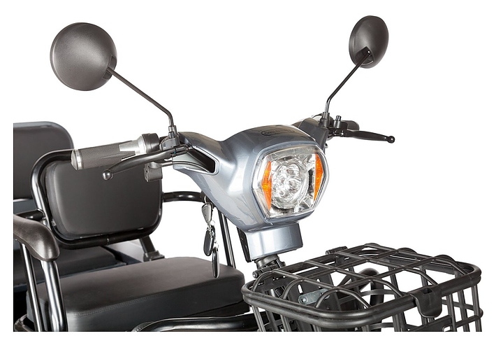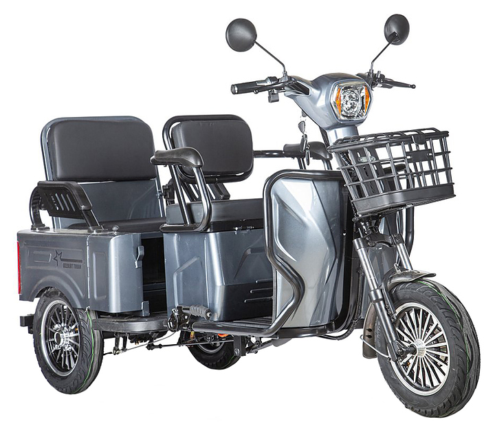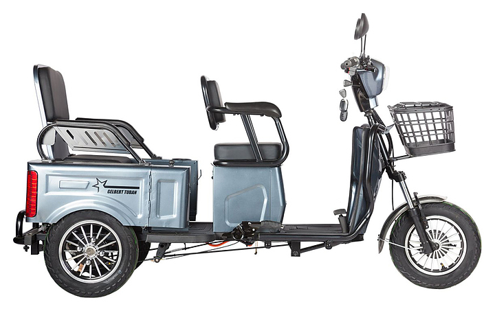 Трицикл Rutrike Gelbert Tuban используется для комфортного передвижения по городским улицам в сухую погоду, а также перевозки пассажиров и бытовых грузов. Модель оснащена яркой фарой, поворотниками, приборной панелью с LED-индикацией, корзиной на руле, 2 комфортными мягкими сиденьями с подлокотниками и спинками. Двухместный трицикл трансформируется в одноместный электроскутер с вместительным кузовом. Корзина выполнена из металла. В комплект поставки входят 2 брелока. Аккумуляторные батареи и зарядное устройство в комплект поставки не входят. Особенности: