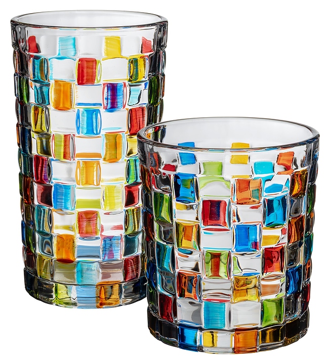 Стакан Олд Фэшн MGline Мозаик 260 мл используется в барах, ресторанах, на других предприятиях общественного питания, а также в домашних условиях для подачи виски со льдом и других напитков. Емкость круглого сечения оснащена расширенным кверху бортом. Изделие выполнено из хрустального стекла с декором внешней поверхности стилизованным под плетение рельефом и расположенными в шахматном порядке разноцветными полупрозрачными квадратиками. Дополнительные характеристики: