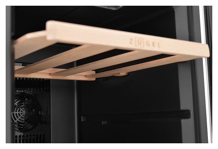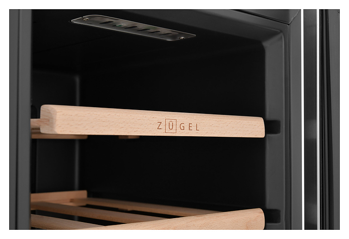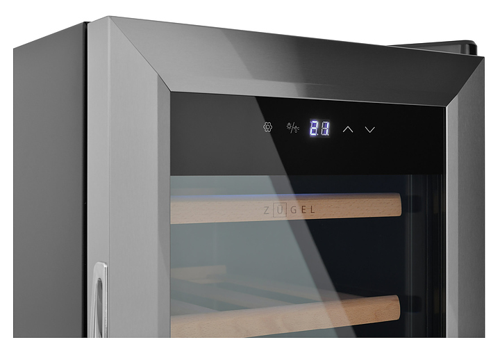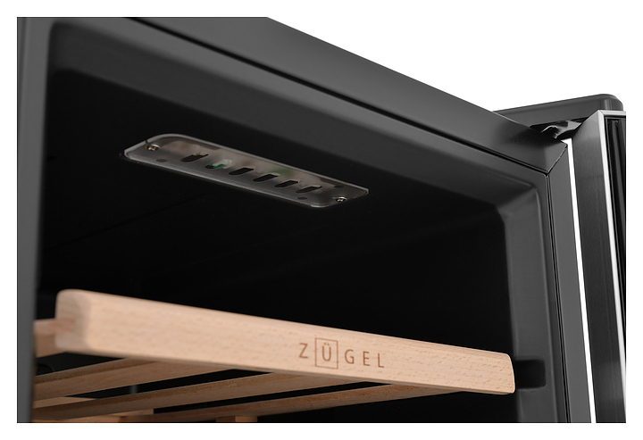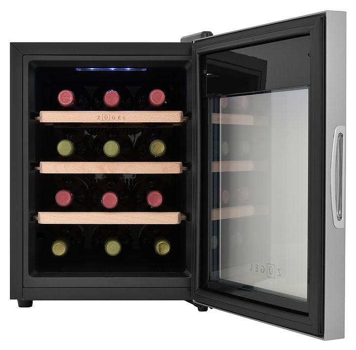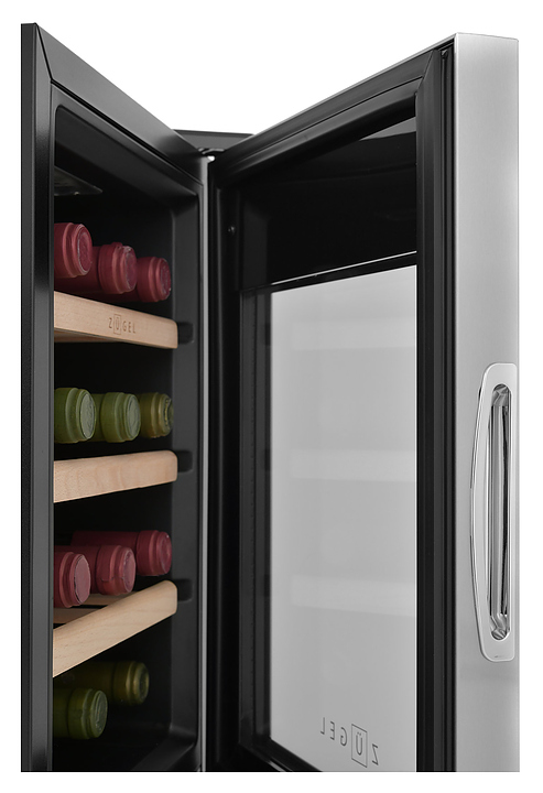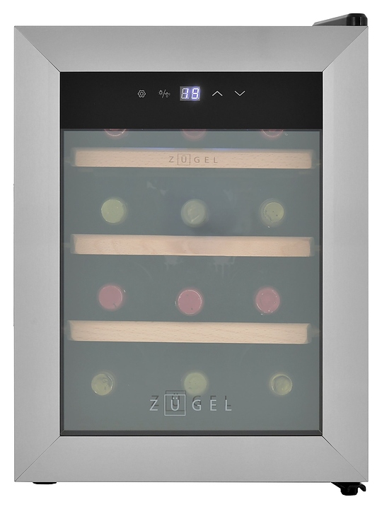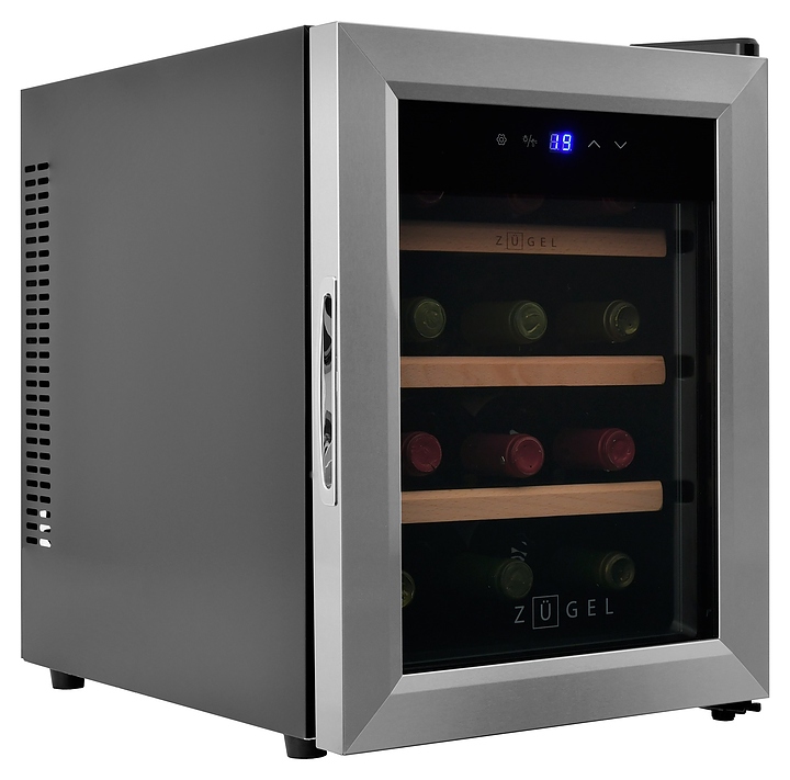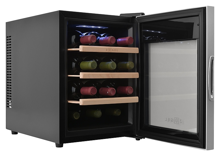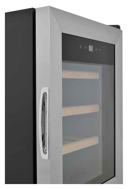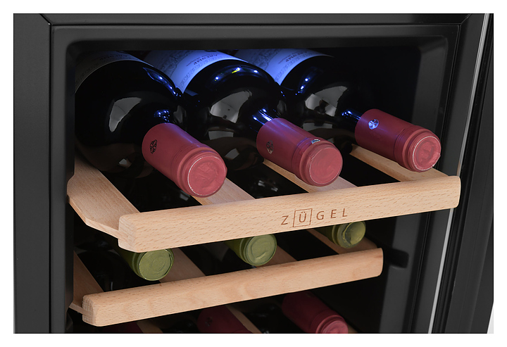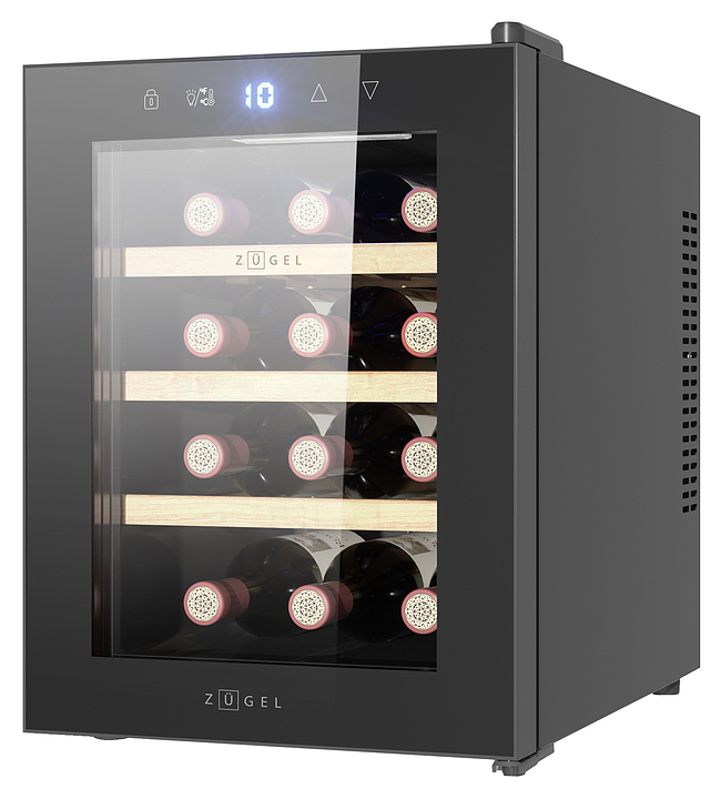 Винный шкаф Zugel ZTWF121B предназначен для хранения при оптимальных условиях бутилированного вина различных сортов в барах, ресторанах, специализированных магазинах, подсобных складских помещениях, а также домашних условиях. Модель оснащена монотемпературной холодильной камерой c интегрированными направляющими для полок, правосторонней распашной дверью с обзорным остеклением, кабелем питания, расположенной на фасаде двери электронной панелью управления с сенсорными функциональными клавишами и цифровым жидкокристаллическим дисплеем с голубой подсветкой индикации. Корпус выполнен из металла с матовым антикоррозийным покрытием черного цвета, рама двери и внутренняя облицовка камеры черного цвета, полки – из массива буковой древесины с фронтальной гравировкой логатипа. В комплект поставки входят 3 съемные полки с направляющими для размещения бутылок, инструкция по эксплуатации, гарантийный талон и заводская упаковка. Особенности: