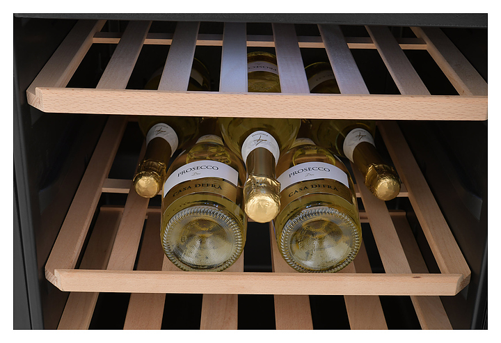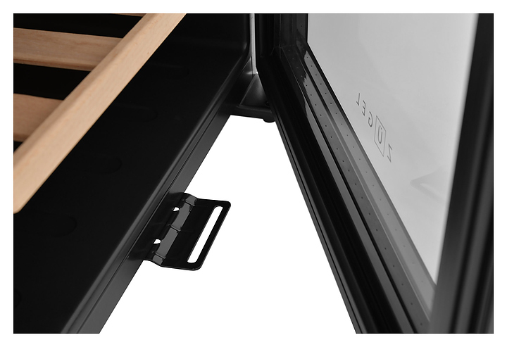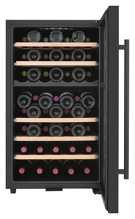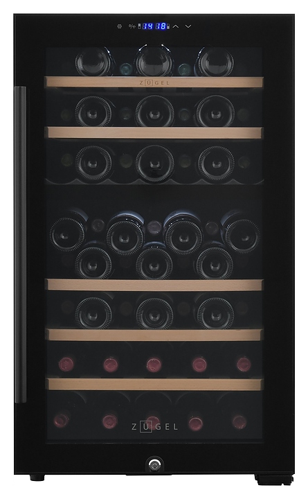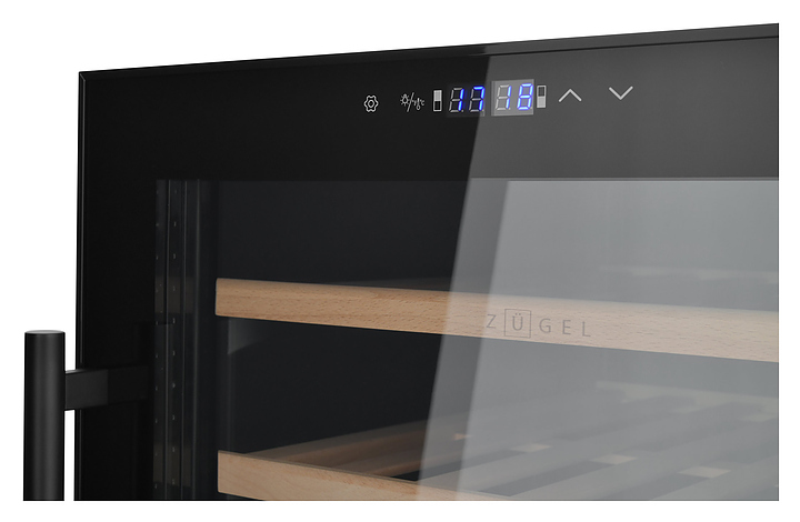 Винный шкаф Zugel ZCWF521DB предназначен для хранения при оптимальных условиях бутилированного вина различных сортов в барах, ресторанах, специализированных магазинах, подсобных складских помещениях, а также домашних условиях. Модель оснащена холодильной камерой c 2 температурными зонами, интегрированными направляющими для полок, правосторонней распашной дверью с длинной трубчатой вертикальной рукояткой и обзорным остеклением, кабелем питания, расположенной на фасаде двери электронной панелью управления с сенсорными функциональными клавишами и цифровым жидкокристаллическим дисплеем с голубой подсветкой индикации. Корпус и рукоятка выполнены из металла с матовым антикоррозийным покрытием черного цвета, дверь с полным фронтальным остеклением без винтового крепежа, рама двери и внутренняя облицовка камеры черного цвета, остекление – из тонированного закаленного стекла, полки – из массива буковой древесины с фронтальной гравировкой логатипа. В комплект поставки входят 5 съемных полок с направляющими для размещения бутылок, комплект ключейк замку, инструкция по эксплуатации, гарантийный талон и заводская упаковка. Особенности: