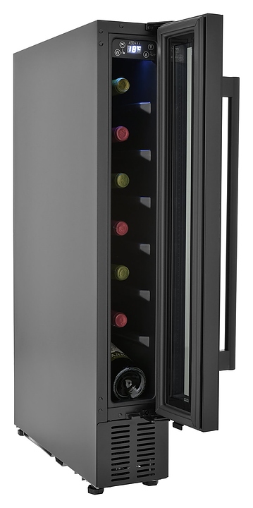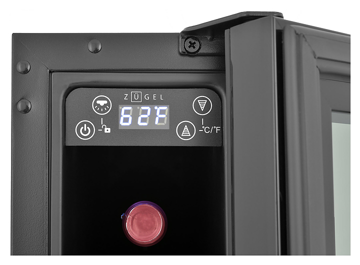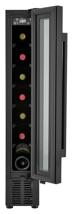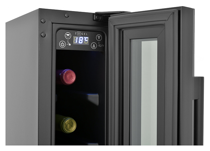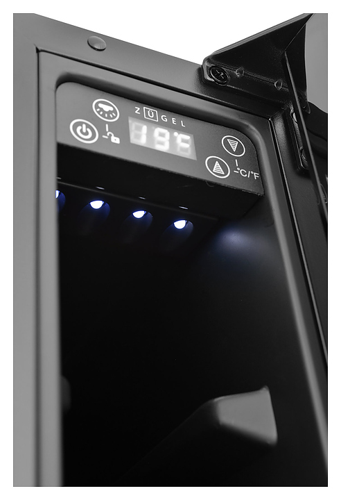Винный шкаф Zugel ZCWI70B предназначен для хранения при оптимальных условиях бутилированного вина различных сортов в барах, ресторанах, специализированных магазинах, подсобных складских помещениях, а также домашних условиях. Модель оснащена монотемпературной холодильной камерой c интегрированными направляющими для размещения бутылок, правосторонней распашной дверью на перенавешиваемых петлях с длинной трубчатой вертикальной рукояткой и обзорным остеклением, цокольной вентиляционной решеткой, кабелем питания, расположенной внутри камеры электронной панелью управления с сенсорными функциональными клавишами и цифровым светодиодным дисплеем с белой подсветкой индикации. Корпус выполнен из металла с антикоррозийным покрытием, дверь с полным фронтальным остеклением без винтового крепежа, рама двери и внутренняя облицовка камеры черного цвета, рукоятка – из металла с матовым покрытием черного цвета, остекление – из закаленного стекла с дымчатой тонировкой. В комплект поставки входят набор крепежа, инструкция по эксплуатации, гарантийный талон и заводская упаковка. Особенности: