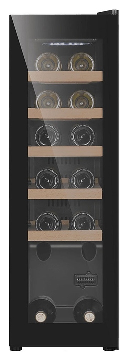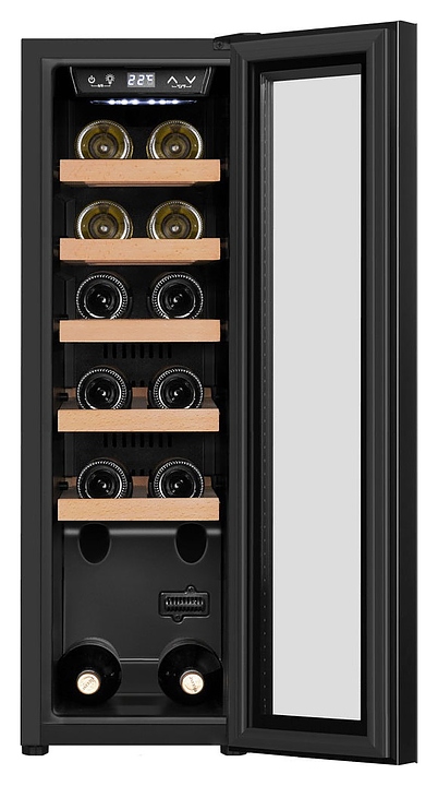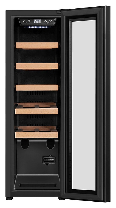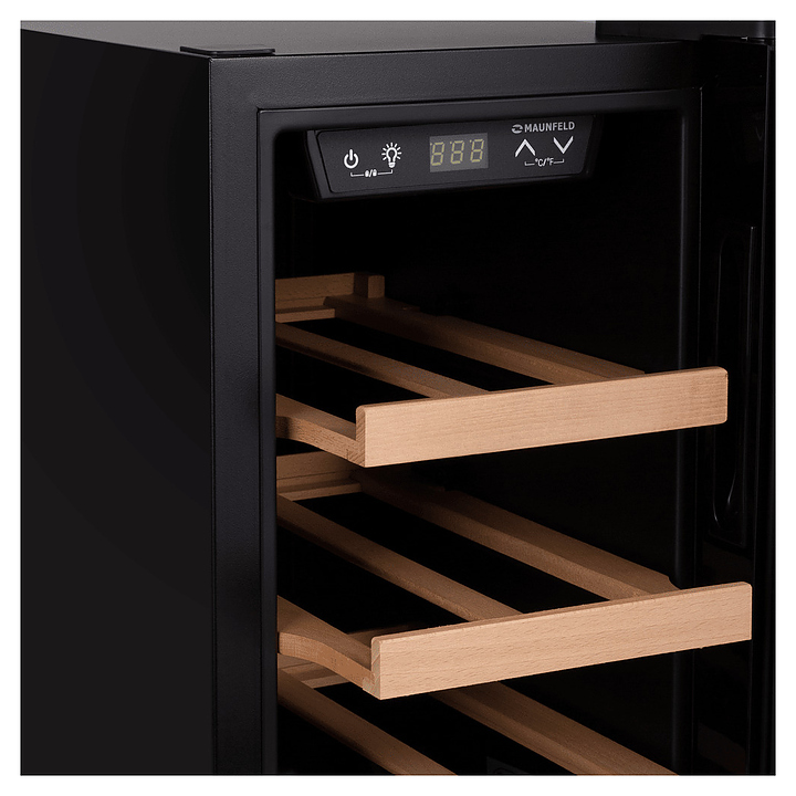 Винный шкаф Maunfeld MFWC-45S12 предназначен для хранения при оптимальных условиях и предпродажной демонстрации бутилированного вина различных сортов в барах, ресторанах, специализированных магазинах, подсобных складских помещениях, а также домашних условиях. Модель оснащена холодильной камерой с правосторонней распашной дверью на перенавешиваемых петлях с обзорным остеклением, кабелем питания, расположенной внутри камеры электронной панелью управления с сенсорными функциональными клавишами и цифровым светодиодным дисплеем с белой подсветкой индикации. Корпус выполнен из металла с матовым антикоррозийным покрытием черного цвета, дверь с полным фронтальным остеклением без винтового крепежа из прозрачного тонированного стекла, внутренняя облицовка камеры черного цвета, полки – из массива буковой древесины. В комплект поставки входят 5 съемных полок с направляющими для размещения бутылок, инструкция по эксплуатации, гарантийный талон и заводская упаковка. Особенности: