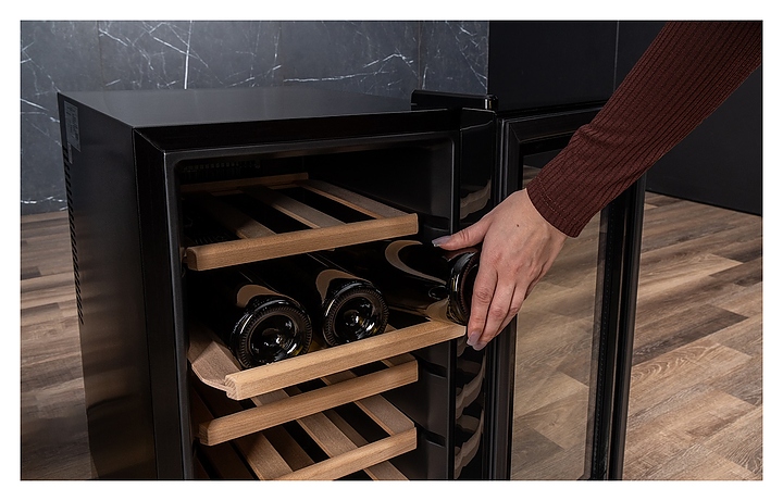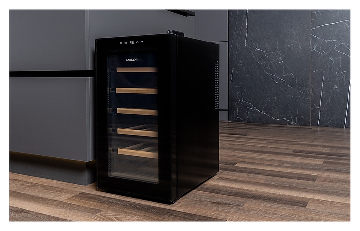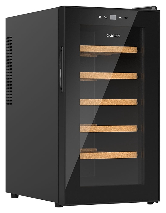 Винный шкаф Garlyn WR-50 предназначен для хранения при оптимальных условиях бутилированного вина различных сортов в барах, ресторанах, специализированных магазинах, подсобных складских помещениях, а также домашних условиях. Модель оснащена монотемпературной холодильной камерой с интегрированными направляющими для полок, правосторонней распашной дверью с обзорным остеклением, кабелем питания, расположенной на фасаде двери электронной панелью управления с сенсорными функциональными клавишами и цифровым светодиодным дисплеем с голубой подсветкой индикации. Корпус выполнен из металла с матовым покрытием черного цвета, дверь с полным фронтальным остеклением без винтового крепежа, рама двери и внутренняя облицовка камеры черного цвета, остекление – из прозрачного закаленного стекла, полки – из массива буковой древесины. В комплект поставки входят 5 съемных полок с направляющими для размещения бутылок, инструкция по эксплуатации, гарантийный талон и заводская упаковка. Особенности: