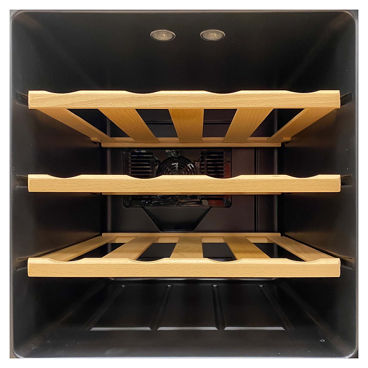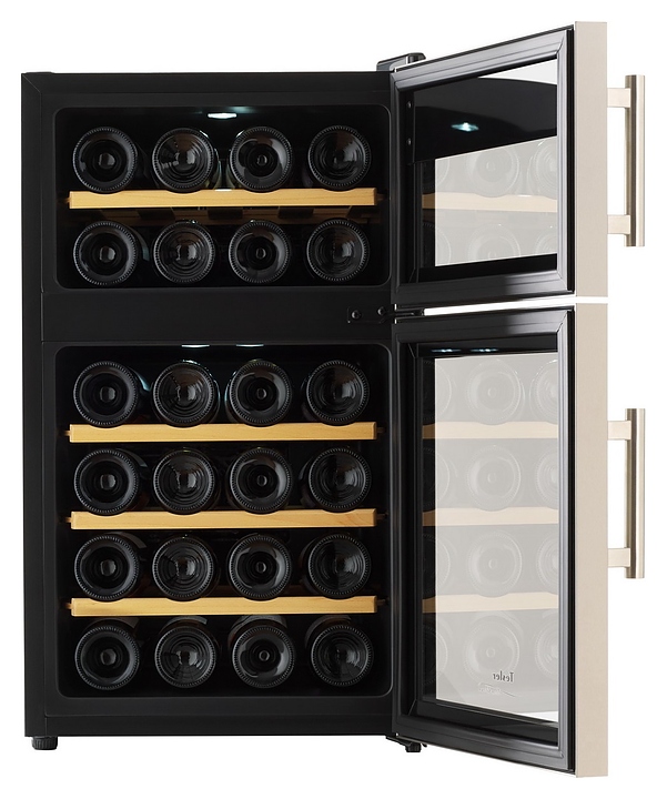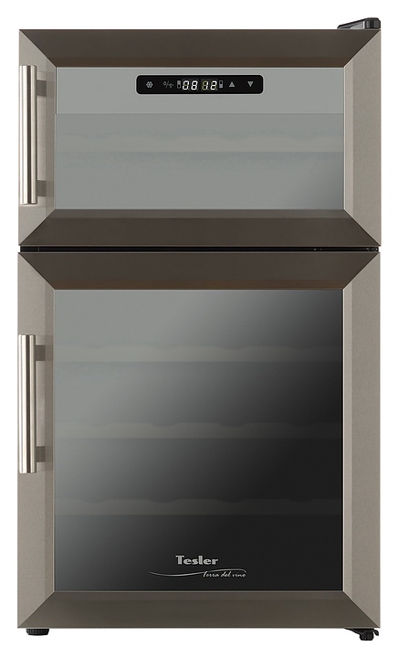 Винный шкаф TESLER WCD-242 предназначен для хранения при оптимальных условиях бутилированного вина различных сортов в барах, ресторанах, специализированных магазинах, подсобных складских помещениях, а также домашних условиях. Модель оснащена 2 холодильными камерами с правосторонними распашными дверьми с вертикальными трубчатыми рукоятками и обзорным остеклением, интегрированными направляющими для полок, кабелем питания, расположенной на фасаде верхней двери электронной панелью управления с сенсорными функциональными клавишами и 2 цифровыми светодиодными дисплеями с белой подсветкой индикации. Корпус выполнен из металла с матовым антикоррозийным покрытием черного цвета, фронт рам дверей и рукоятки – из металла с серебристой поверхностью, внутренняя облицовка камер черного цвета, остекление – из прозрачного закаленного стекла c зеркальной фронтальной поверхностью, полки – из массива древесины светлых пород. В комплект поставки входят 4 съемные полки с направляющими для размещения бутылок, инструкция по эксплуатации, гарантийный талон и заводская упаковка. Особенности: