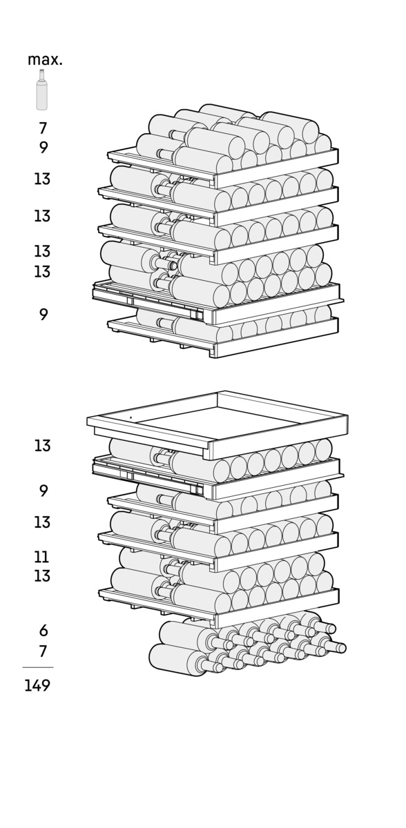 9 решетчатых полок, включая выдвижные на телескопических направляющих SoftTelescopic полного выдвижения с механизмом самозакрывания и демпфированием, включая презентационную с наклонной секцией