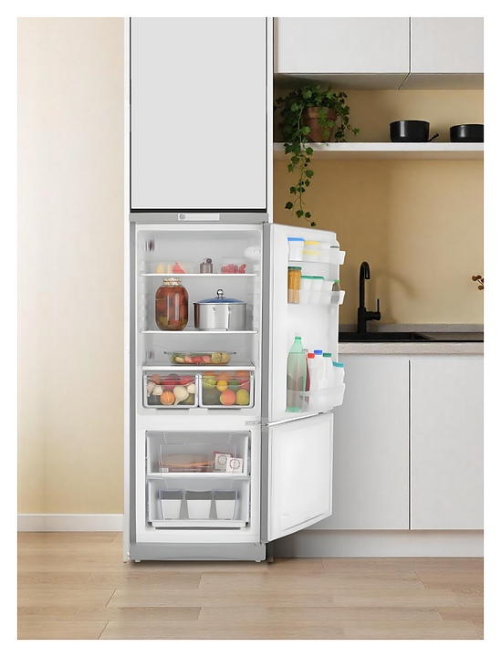 Холодильник Indesit ES 15 GA предназначен для охлаждения, замораживания, кратковременного и длительного хранения пищевых продуктов и напитков в гостиничных комплексах, офисах, а также домашних условиях. Модель оснащена холодильной камерой сверху и морозильной камерой снизу, правосторонними распашными дверьми на перенавешиваемых петлях, кабелем питания с вилкой и расположенной в верхней части фронта электромеханической панелью управления. Фасады дверей и боковины выполнены из металла с антикоррозийным покрытием серебристого оттенка, внутренняя облицовка камер – из белого пластика, плоские полки – из прочного прозрачного закаленного стекла с фронтальной окантовкой белого цвета, ящики холодильного отделения и навесные полки – из прозрачного пластика, ящики морозильного отделения – из белого пластика с прозрачным фронтом, упаковка – из гофрокартона, полимерной пленки и полистирола. Комплектация: