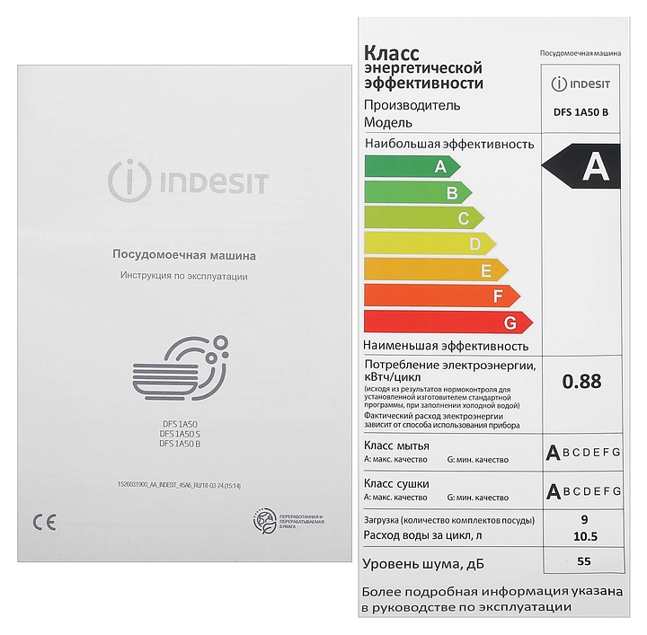 Eco: 50 °C / 215 мин. / 10,5 л / 0,88 кВт⋅ч