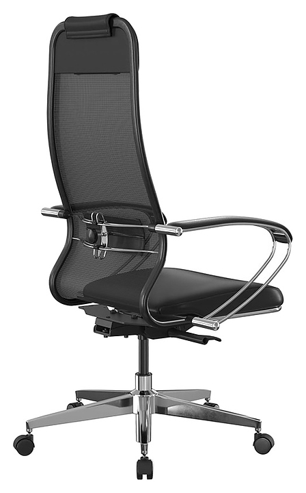 Офисное кресло ErgoLife Comfort серии SynchroSit 10 предназначено для комфортного размещения пользователя в кабинетах и офисах различных учреждений, а также в домашних условиях. Газлифт, подлокотники и пятилучье выполнены из стали с хромированной поверхностью, каркас спинки – из стали с полимерным покрытием черного цвета, каркасы спинки и сиденья с хромированным молдингом, корпус механизма качания – из стали, обтяжка спинки – из сетчатой ткани X2, обивка сиденья – из экокожи Extra с частичной перфорацией и прошивкой «боковые манжеты», подголовник – из экокожи Infinity Easy Clean легкой очистки, мягкие накладки подлокотников – из экокожи Extra, ролики – из полиамида с полиуретановым ободком, исполнение отделки и роликов в черной цветовой гамме. Комплектация: