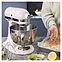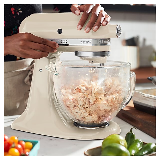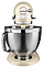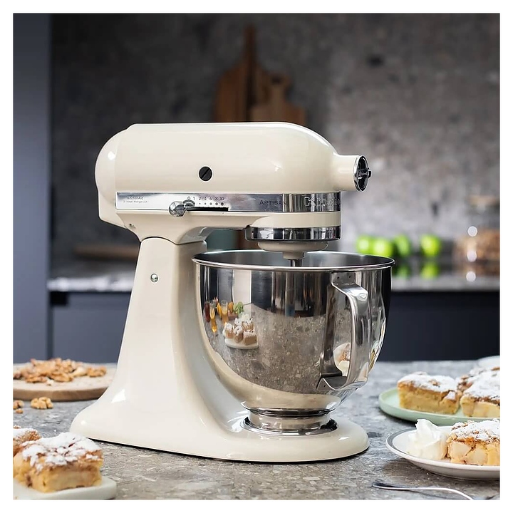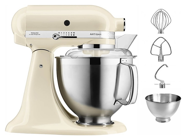 Настольный планетарный миксер KitchenAid Artisan 5KSM185PSEAC используется в домашних условиях для замеса теста различной консистенции, в том числе белкового, заварного, дрожжевого, бисквитного, а также приготовления пюре, кремов, муссов и соусов. Механизм вращения месильного органа аналогичен поступательно-вращательному движению планет, причем насадка вращается вдоль своей оси в противоположном направлении поступательному движению, таким образом ингредиенты тщательно перемешиваются в однородную массу. Модель оснащена электродвигателем переменного тока, подъемной (откидной) головкой моторного блока, кабелем питания с вилкой и электромеханической панелью управления. Литой корпус обтекаемой формы выполнен из цинка с покрытием эмалью оттенка миндальный крем (Almond Cream) и декоративной серебристой полосой с логотипом по периметру нижней части головки, рукоятки управления – из металла с хромированной поверхностью, чаши – из нержавеющей стали с серебристой поверхностью и матовой текстурой внешней стороны борта, насадки – из нержавеющей стали, защитный обод – из пластика. Комплектация: