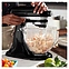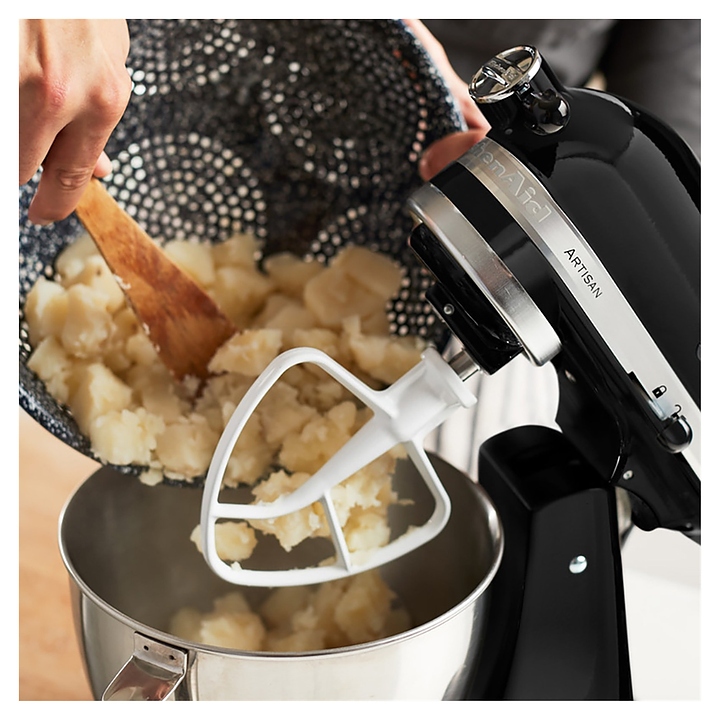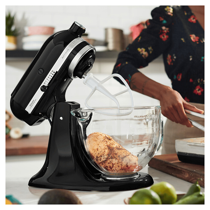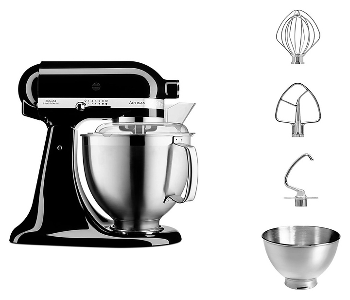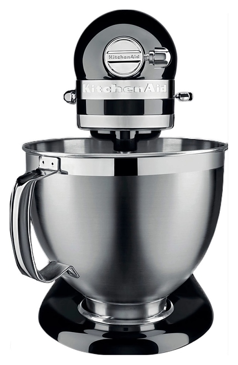 Настольный планетарный миксер KitchenAid Artisan 5KSM185PSEOB используется в домашних условиях для замеса теста различной консистенции, в том числе белкового, заварного, дрожжевого, бисквитного, а также приготовления пюре, кремов, муссов и соусов. Механизм вращения месильного органа аналогичен поступательно-вращательному движению планет, причем насадка вращается вдоль своей оси в противоположном направлении поступательному движению, таким образом ингредиенты тщательно перемешиваются в однородную массу. Модель оснащена электродвигателем переменного тока, подъемной (откидной) головкой моторного блока, кабелем питания с вилкой и электромеханической панелью управления. Литой корпус обтекаемой формы выполнен из цинка с покрытием эмалью оттенка черный оникс (Onyx Black) и декоративной серебристой полосой с логотипом по периметру нижней части головки, рукоятки управления – из металла с хромированной поверхностью, чаши – из нержавеющей стали с серебристой поверхностью и матовой текстурой внешней стороны борта, насадки – из нержавеющей стали, защитный обод – из пластика. Комплектация: