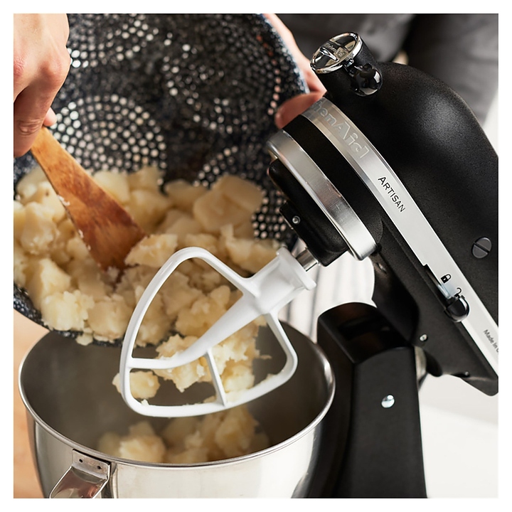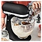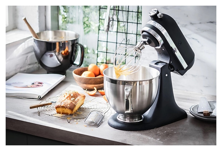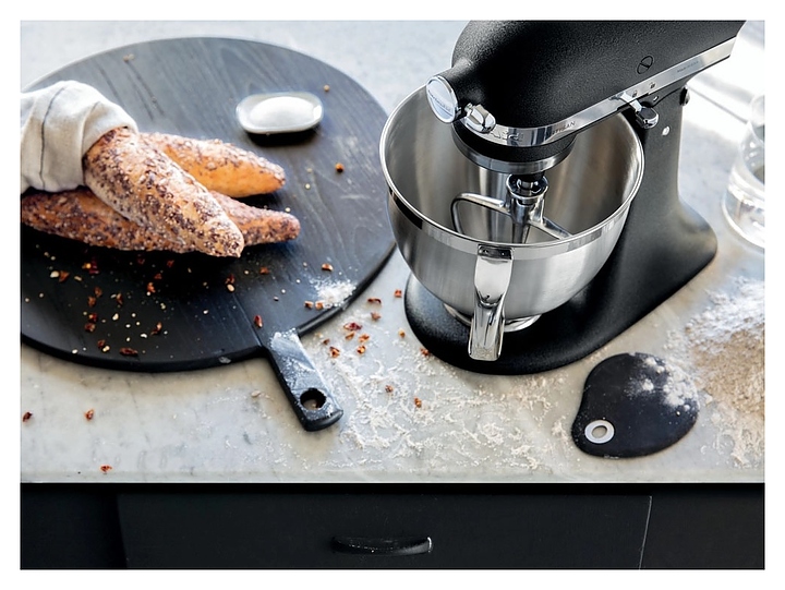 Настольный планетарный миксер KitchenAid Artisan 5KSM185PSEBK используется в домашних условиях для замеса теста различной консистенции, в том числе белкового, заварного, дрожжевого, бисквитного, а также приготовления пюре, кремов, муссов и соусов. Механизм вращения месильного органа аналогичен поступательно-вращательному движению планет, причем насадка вращается вдоль своей оси в противоположном направлении поступательному движению, таким образом ингредиенты тщательно перемешиваются в однородную массу. Модель оснащена электродвигателем переменного тока, подъемной (откидной) головкой моторного блока, кабелем питания с вилкой и электромеханической панелью управления. Литой корпус обтекаемой формы выполнен из цинка с покрытием эмалью оттенка черный чугун (Cast Iron Black Edition) и декоративной серебристой полосой с логотипом по периметру нижней части головки, рукоятки управления – из металла с хромированной поверхностью, чаши – из нержавеющей стали с серебристой поверхностью и матовой текстурой внешней стороны борта, насадки – из нержавеющей стали, защитный обод – из пластика. Комплектация: