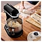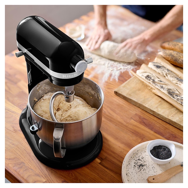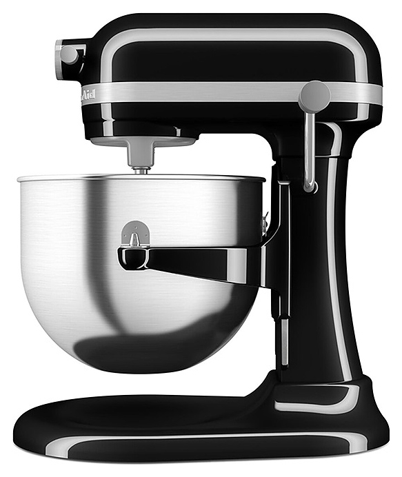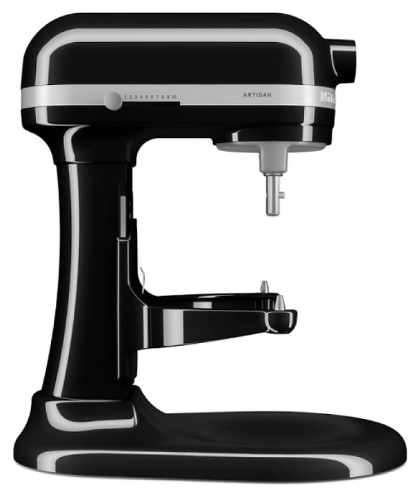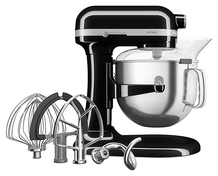 Настольный планетарный миксер KitchenAid Artisan 5KSM70SHXEOB серии Heavy Duty используется в домашних условиях для замеса теста различной консистенции, в том числе белкового, заварного, дрожжевого, бисквитного, а также приготовления пюре, кремов, муссов и соусов. Механизм вращения месильного органа аналогичен поступательно-вращательному движению планет, причем насадка вращается вдоль своей оси в противоположном направлении поступательному движению, таким образом ингредиенты тщательно перемешиваются в однородную массу. Модель оснащена электродвигателем переменного тока, механизмом подъема и опускания чаши с фиксирующими лапками, кабелем питания с вилкой и электромеханической панелью управления. Литой корпус обтекаемой формы выполнен из цинка с покрытием износостойкой эмалью оттенка черный оникс (Onyx Black) и декоративной серебристой полосой с логотипом по периметру нижней части головки моторного блока, рычаги управления – из металла с полимерными рукоятками, чаша – из нержавеющей стали с серебристой полированной поверхностью, венчик, крюк и лопатка – из нержавеющей стали, лопатка с гибким ребром – из металла с антибактериальным полиэфирным покрытием с содержанием серебра, защитный обод – из пластика. Комплектация: