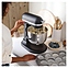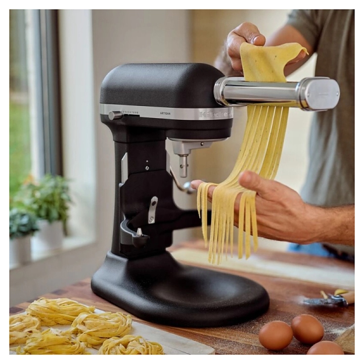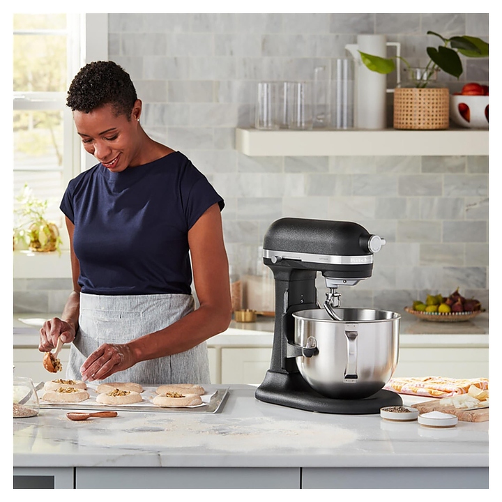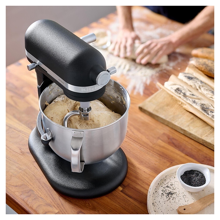 Настольный планетарный миксер KitchenAid Artisan 5KSM70SHXEBK серии Heavy Duty используется в домашних условиях для замеса теста различной консистенции, в том числе белкового, заварного, дрожжевого, бисквитного, а также приготовления пюре, кремов, муссов и соусов. Механизм вращения месильного органа аналогичен поступательно-вращательному движению планет, причем насадка вращается вдоль своей оси в противоположном направлении поступательному движению, таким образом ингредиенты тщательно перемешиваются в однородную массу. Модель оснащена электродвигателем переменного тока, механизмом подъема и опускания чаши с фиксирующими лапками, кабелем питания с вилкой и электромеханической панелью управления. Литой корпус обтекаемой формы выполнен из цинка с покрытием износостойкой эмалью оттенка черный чугун (Cast Iron Black Edition) и декоративной серебристой полосой с логотипом по периметру нижней части головки моторного блока, рычаги управления – из металла с полимерными рукоятками, чаша – из нержавеющей стали с серебристой полированной поверхностью, венчик, крюк и лопатка – из нержавеющей стали, лопатка с гибким ребром – из металла с антибактериальным полиэфирным покрытием с содержанием серебра, защитный обод – из пластика. Комплектация: