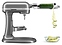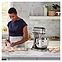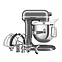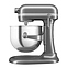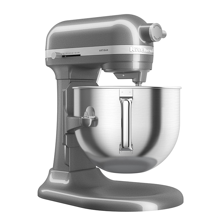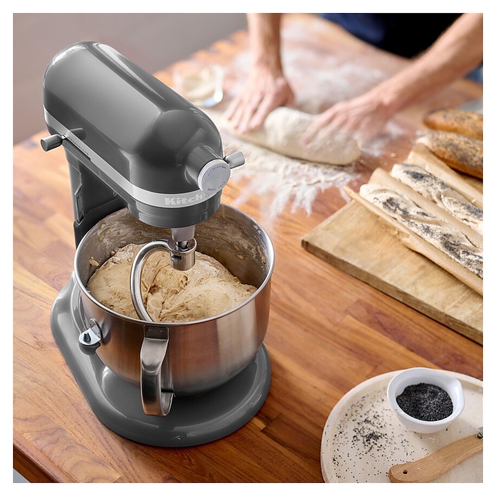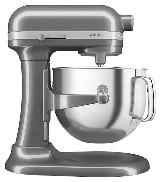 Настольный планетарный миксер KitchenAid Artisan 5KSM70SHXEMS серии Heavy Duty используется в домашних условиях для замеса теста различной консистенции, в том числе белкового, заварного, дрожжевого, бисквитного, а также приготовления пюре, кремов, муссов и соусов. Механизм вращения месильного органа аналогичен поступательно-вращательному движению планет, причем насадка вращается вдоль своей оси в противоположном направлении поступательному движению, таким образом ингредиенты тщательно перемешиваются в однородную массу. Модель оснащена электродвигателем переменного тока, механизмом подъема и опускания чаши с фиксирующими лапками, кабелем питания с вилкой и электромеханической панелью управления. Литой корпус обтекаемой формы выполнен из цинка с покрытием износостойкой эмалью оттенка серебряный медальон (Medallion Silver) и декоративной серебристой полосой с логотипом по периметру нижней части головки моторного блока, рычаги управления – из металла с полимерными рукоятками, чаша – из нержавеющей стали с серебристой полированной поверхностью, венчик, крюк и лопатка – из нержавеющей стали, лопатка с гибким ребром – из металла с антибактериальным полиэфирным покрытием с содержанием серебра, защитный обод – из пластика. Комплектация: