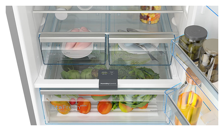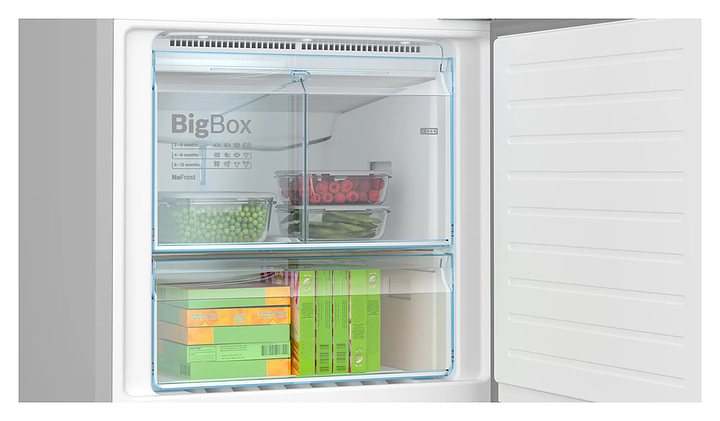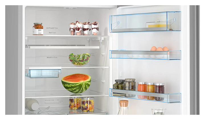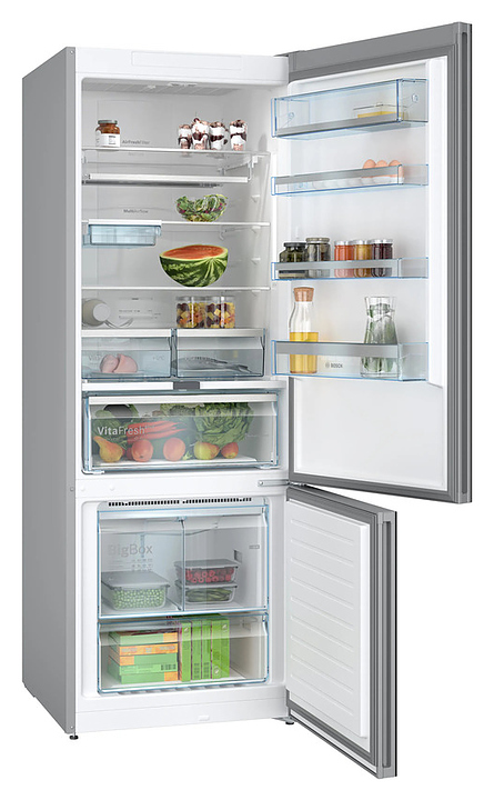 Холодильник Bosch KGN56LB31U предназначен для охлаждения, замораживания, кратковременного и длительного хранения продуктов питания в частных домах, квартирах, отелях и офисах. Модель оснащена электронным управлением с сенсорными элементами, дисплеем, внутренним светодиодным освещением холодильной камеры и встроенной вертикальной ручкой. Система охлаждения No Frost предотвращает образование льда и инея внутри холодильной и морозильной камер, что упрощает обслуживание, экономит энергию и поддерживает оптимальные условия для хранения продуктов. Функция Home Connect позволяет управлять холодильником дистанционно через смартфон или планшет. Полки и покрытие дверцы выполнены из высокопрочного стекла. Особенности: