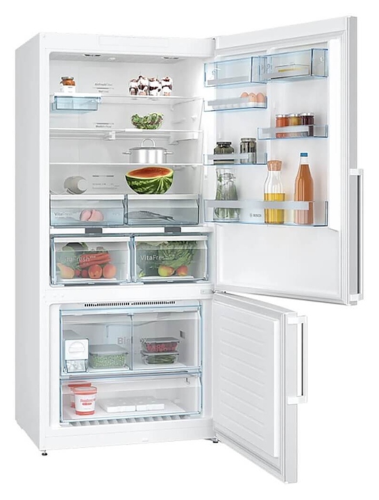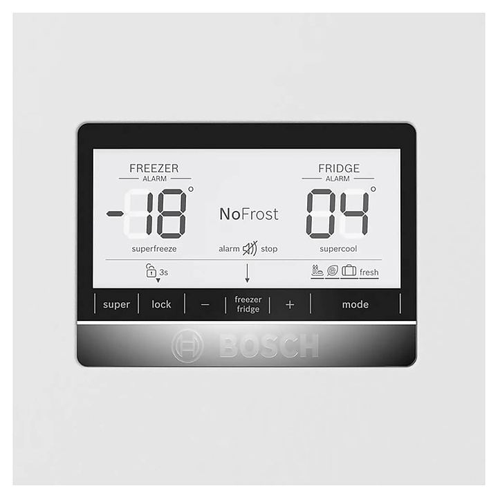 Холодильник Bosch KGN86AW32U предназначен для охлаждения, замораживания, кратковременного и длительного хранения продуктов питания в частных домах, квартирах, отелях и офисах. Модель оснащена электронным управлением с сенсорными элементами, дисплеем, внутренним светодиодным освещением холодильной камеры и вертикальной накладной ручкой. Система охлаждения No Frost предотвращает образование льда и инея внутри холодильной и морозильной камер, что упрощает обслуживание, экономит энергию и поддерживает оптимальные условия для хранения продуктов. Функция MultiAirflow обеспечивает равномерное распределение холодного воздуха по всему объему. Полки выполнены из высокопрочного стекла. Особенности: