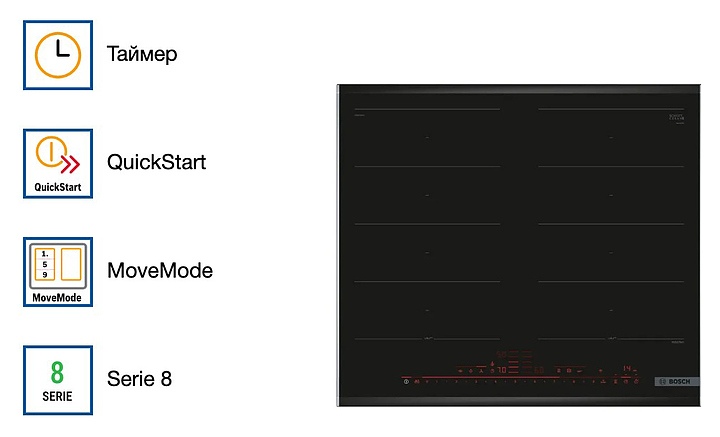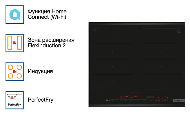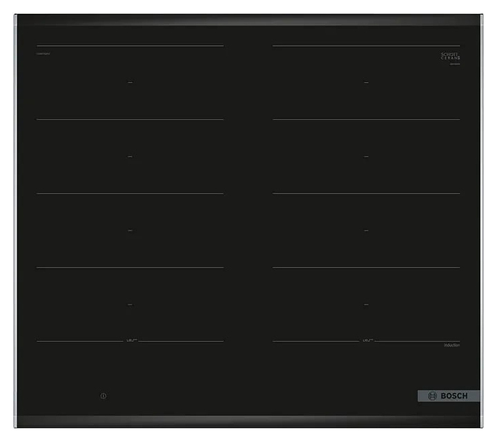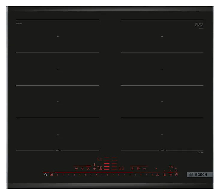 Варочная панель Bosch PXX675DV1E предназначена для приготовления большого ассортимента блюд в наплитной посуде в домашних условиях. Модель оснащена сенсорной системой управления DirectSelect Premium, LCD дисплеем и таймером. Индукционная технология обеспечивает передачу до 90% энергии непосредственно посуде, что значительно экономит электроэнергию по сравнению с традиционными плитами. Отсутствие открытого огня и минимальный нагрев окружающей среды делают приготовление пищи более безопасным и комфортным. Поверхность выполнена из стеклокерамики, профиль по бокам - из металла. Особенности: