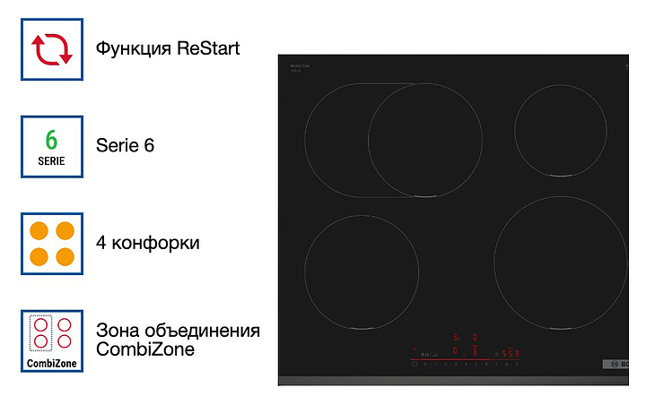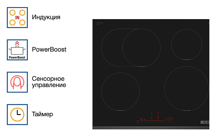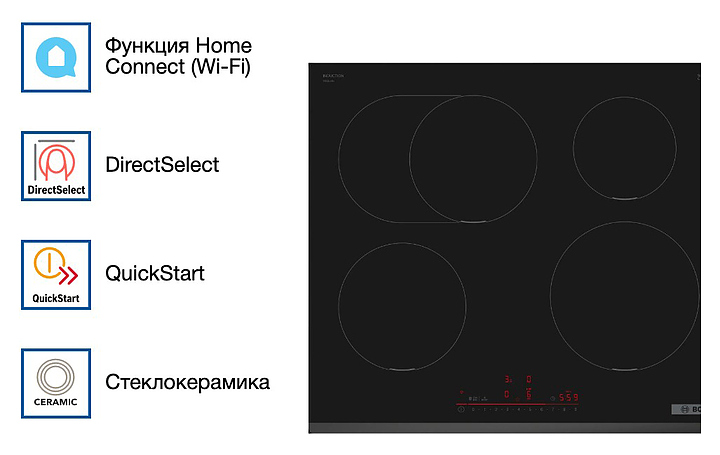 Варочная панель Bosch PIF631HB1E предназначена для приготовления большого ассортимента блюд в наплитной посуде в домашних условиях. Модель оснащена сенсорной системой управления DirectSelect и таймером. Индукционная технология обеспечивает передачу до 90% энергии непосредственно посуде, что значительно экономит электроэнергию по сравнению с традиционными плитами. Отсутствие открытого огня и минимальный нагрев окружающей среды делают приготовление пищи более безопасным и комфортным. Поверхность выполнена из стеклокерамики. Особенности: