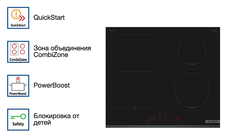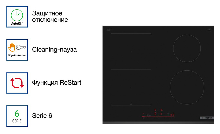 Варочная панель Bosch PVS631HC1E предназначена для приготовления большого ассортимента блюд в наплитной посуде в домашних условиях. Модель оснащена сенсорной системой управления DirectSelect и таймером. Индукционная технология обеспечивает передачу до 90% энергии непосредственно посуде, что значительно экономит электроэнергию по сравнению с традиционными плитами. Отсутствие открытого огня и минимальный нагрев окружающей среды делают приготовление пищи более безопасным и комфортным. Поверхность выполнена из стеклокерамики. Особенности: