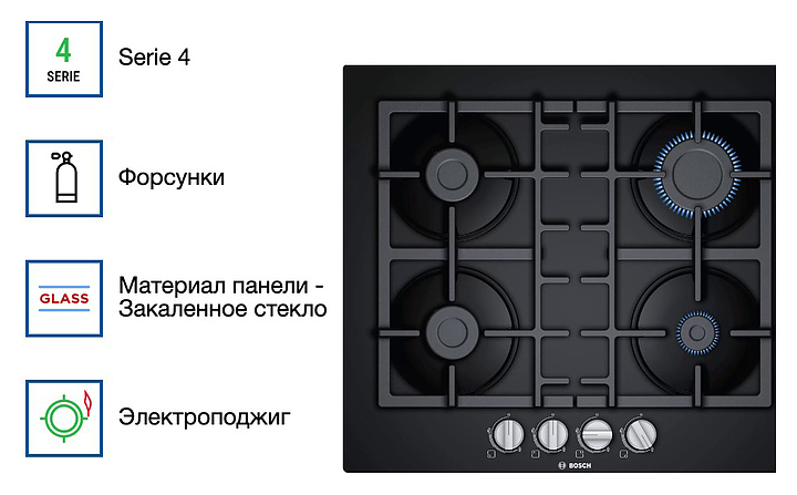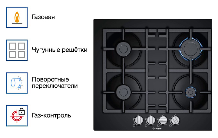 Газовая варочная панель Bosch PNP6B6B90 серии 4 предназначена для приготовления большого ассортимента блюд в наплитной посуде в домашних условиях. Модель оснащена 4 конфорками различной мощности, поворотными переключателями и прямым краем. Термоэлектрическая защита от утечки газа и автоматический электроподжиг гарантируют комфортную и безопасную эксплуатацию. Рабочая поверхность выполнена из закаленного стекла, решетки - из чугуна. В комплект поставки входят форсунки (жиклеры) для баллонного газа и сетевой кабель с евровилкой. Дополнительные характеристики: