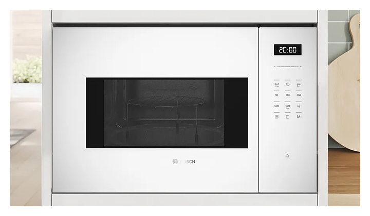 Встраиваемая микроволновая печь Bosch BEL554MW2 серии 6 предназначена для приготовления пищи, подогрева готовых блюд и ингредиентов, а также размораживания полуфабрикатов в частных домах, квартирах, отелях и офисах. Модель оснащена электронным управлением, сенсорной панелью TouchControl, кнопкой старт/стоп, LED дисплеем, часами и таймером. Функция AutoPilot самостоятельно регулирует температуру, время приготовления и режимы нагрева без необходимости следить за процессом. Внутренняя поверхность выполнена из нержавеющей стали. В комплект поставки входят стеклянное поворотное блюдо и решетка для гриля. Особенности: