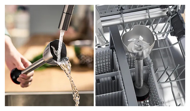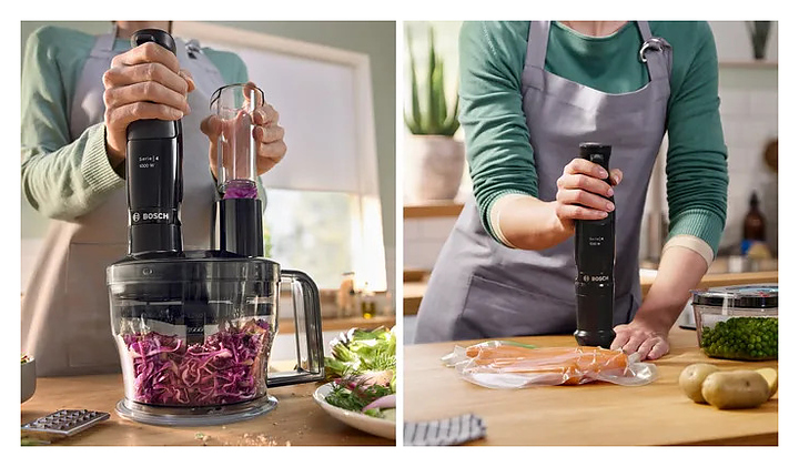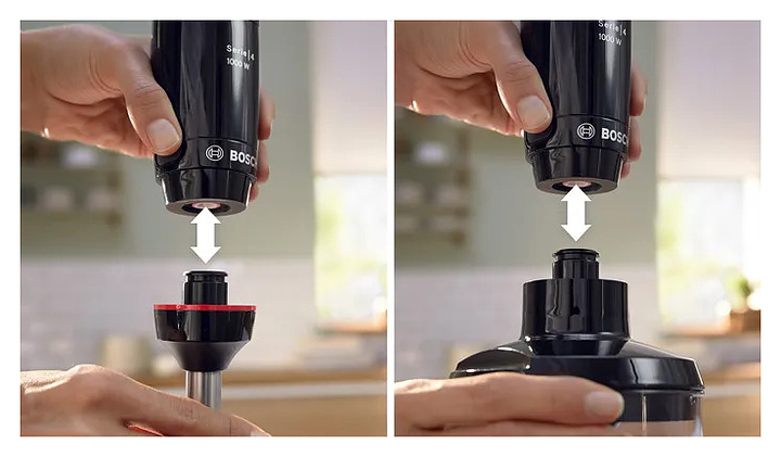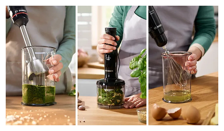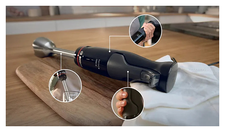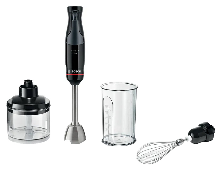 Погружной блендер Bosch MSM4B621 серии ErgoMixx предназначен для взбивания жидкого теста, кремов и коктейлей, измельчения фруктов, овощей, орехов и трав, а также приготовления соусов и супов-пюре в домашних условиях. Модель оснащена ножом с 4 лезвиями QuattroBlade, эргономичной ручкой, удобно расположенными функциональными кнопками и бесступенчатой регулировкой скорости. Съемные детали можно мыть в посудомоечной машине. Корпус, измельчитель и мерный стакан измельчителя выполнены из пластика, погружная часть - из нержавеющей стали. Комплектация: