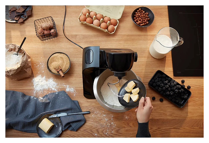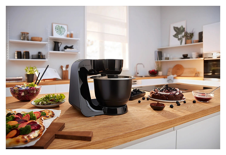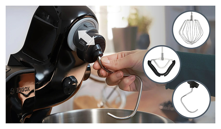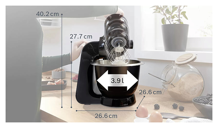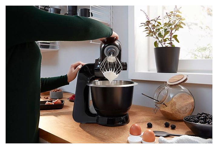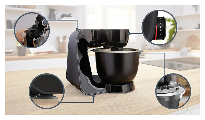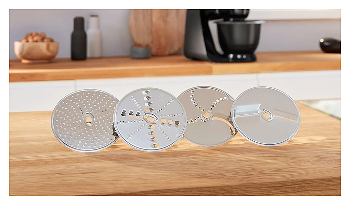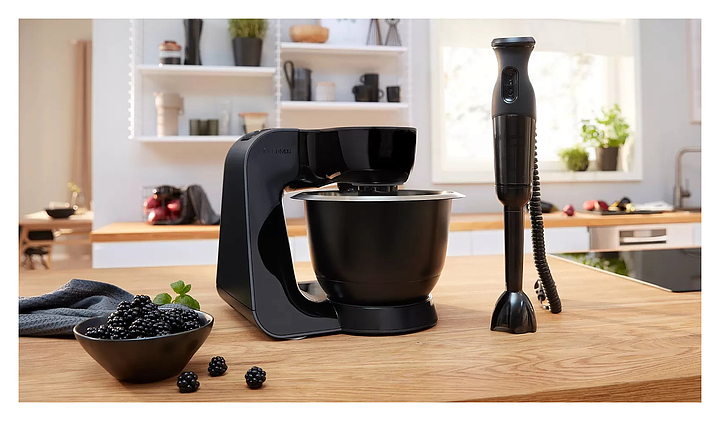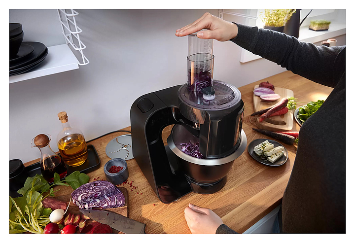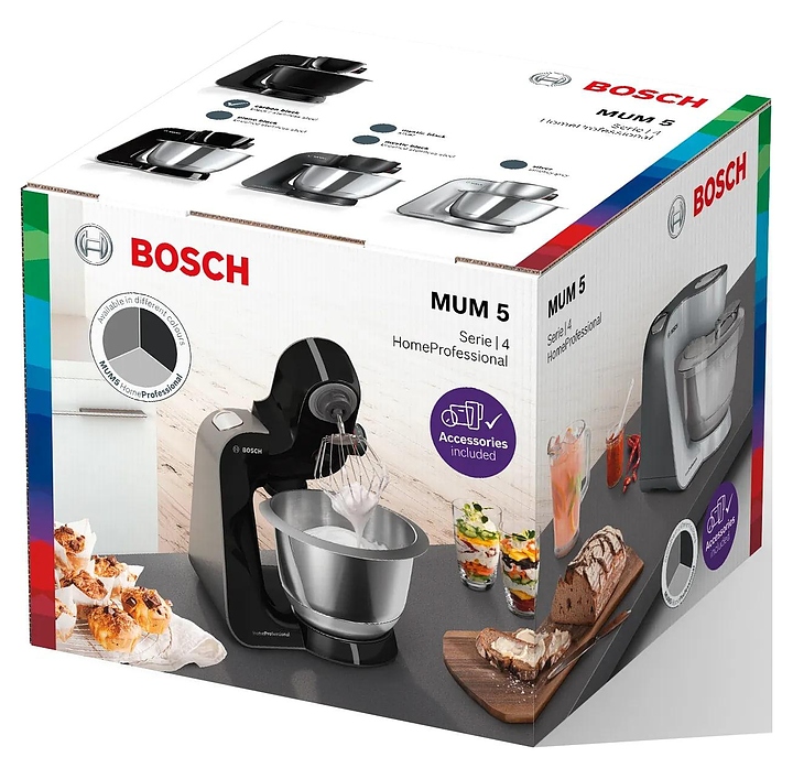 Кухонный комбайн Bosch MUM59N26CB серии MUM5 предназначен для замеса теста, смешивания и взбивания различных продуктов в квартирах и частных домах. Модель оснащена механическим блоком управления, поворотным переключателем и индикатором работы. При нажатии кнопки «Импульсный режим» комбайн начинает работу, при отпускании - мгновенно прекращает, что позволяет строго контролировать процесс измельчения или перемешивания. Технология EasyArmLift осуществляет быструю и легкую смену насадок нажатием кнопки. Корпус выполнен из пластика, чаша - из нержавеющей стали, ножки - из резины. Комплектация: