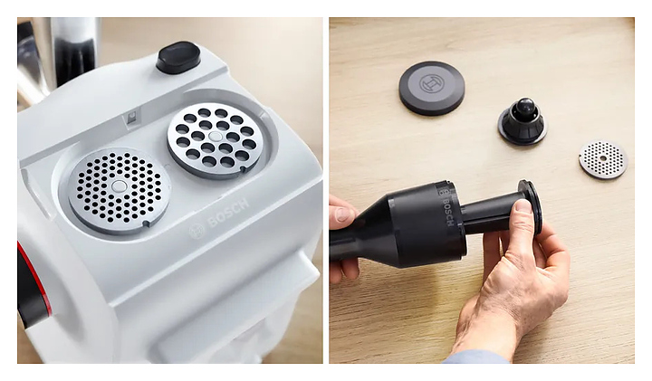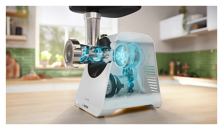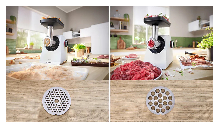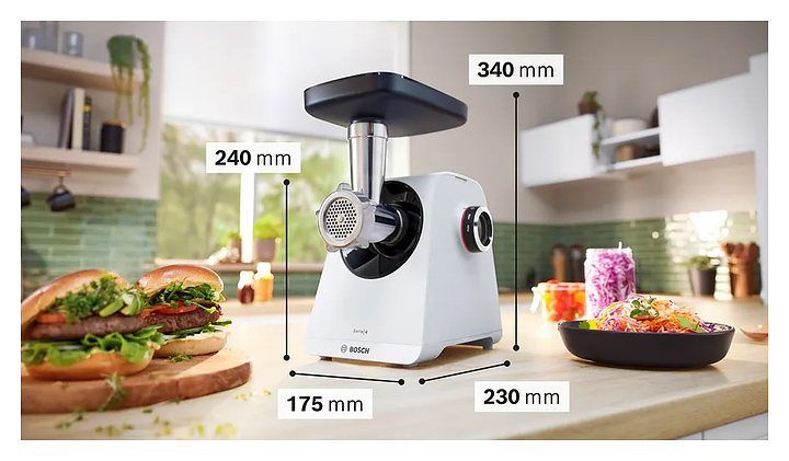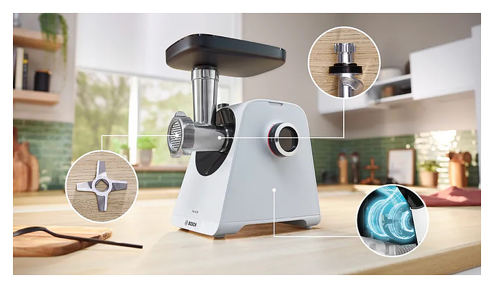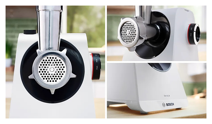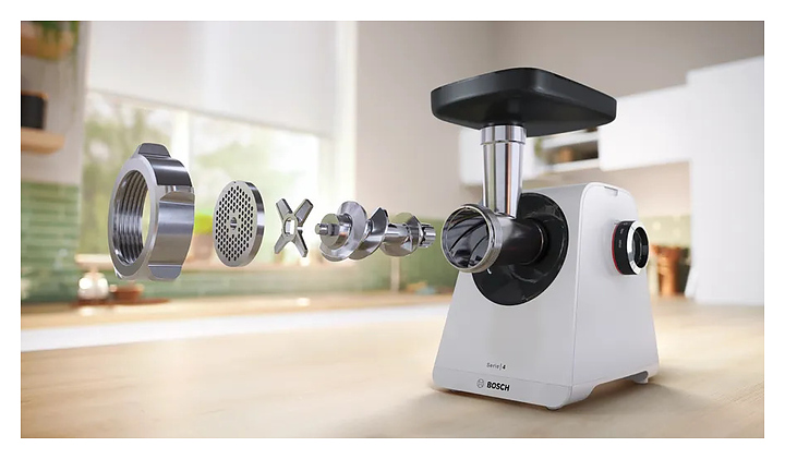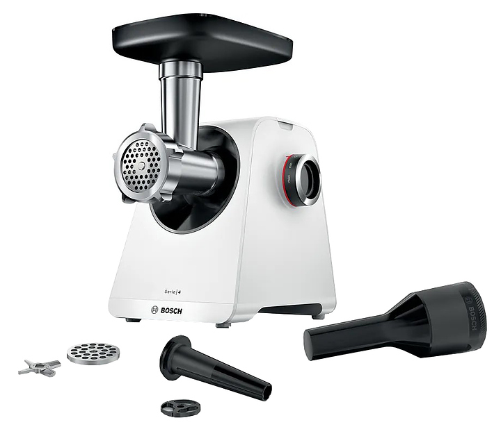 Мясорубка Bosch MFWS420W измельчает мясо и рыбу при производстве фарша и формирования колбасок. Модель оснащена 2 насадками и мощным двигателем. Нож с двустронней заточкой гарантирует идеальное рубление мяса, формовочные диски для фарша позволяют получить продукт нужной консистенции. Универсальный толкатель обеспечивает равномерное прохождение продуктов через мясорубку. Функция обратного хода реверс позволяет вернуть застрявший кусок в загрузочное отверстие для изъятия или повторной попытки переработки. Корпус и лоток выполнены из высококачественного пластика, который отличается долговечностью и надежностью при длительном использовании. Комплектация: